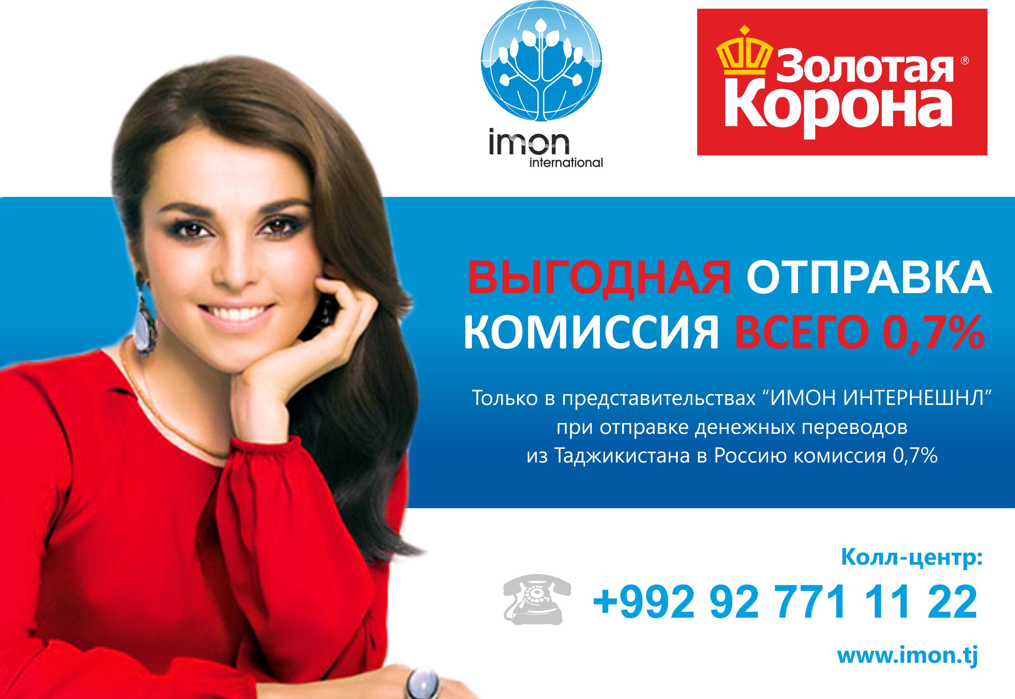 ИМОН ИНТЕРНЕШНЛ совместно с системой денежных переводов «Золотая Корона» запустили акцию, благодаря которой каждый клиент может отправить деньги в Россию через «Золотую Корону» всего лишь за 0,7% комиссии в любом из представительств ИМОН ИНТЕРНЕШНЛ, — сообщили «АП» в пресс-службе Организации.