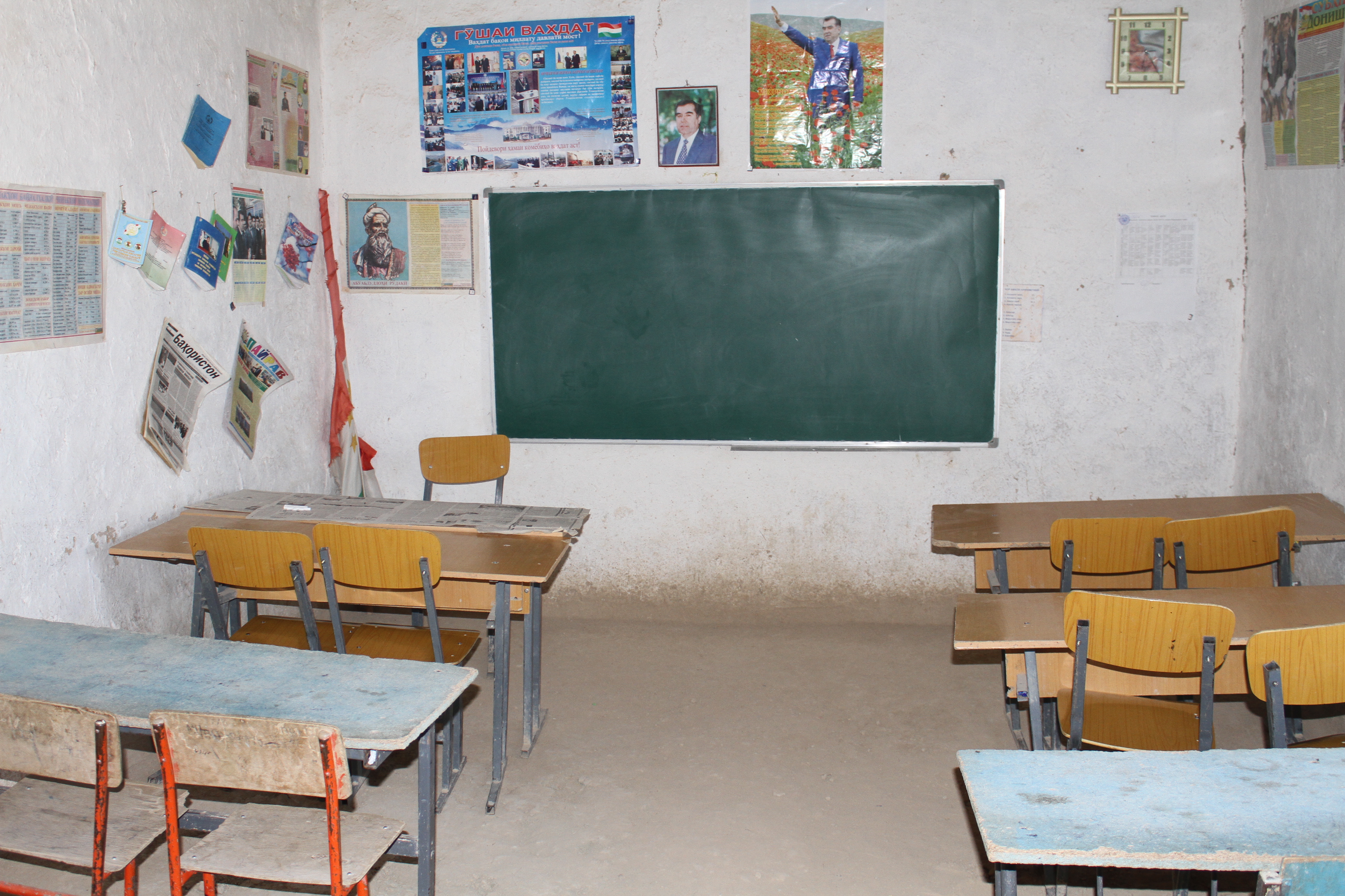 У оврага — покосившийся домик из двух комнат с глиняным полом, печкой-буржуйкой в одном углу и кучей дров в другом, это и есть филиал 9-летней школы №37 соседнего кишлака Наволик. Здесь учатся начальные классы. Всего у единственного в кишлаке учителя Бахтиёра 12 учеников.