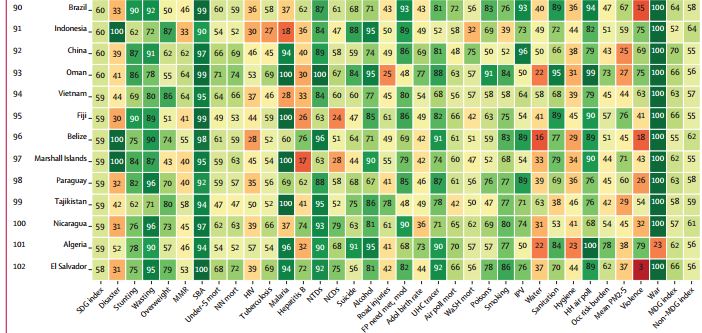 Уровень здоровья в странах сравнивается по 33 показателям, среди них — доступность чистой воды, уровень гигиены, использование средств контрацепции, употребление алкоголя и курение, лишний вес, младенческая смертность, уровень заболеваемости туберкулезом, малярией, гепатитом B, количество людей, погибших в ДТП, в результате насильственных действий или во время войны, покончивших жизнь самоубийством, переживших насилие со стороны партнера. По каждому из показателей стране выставляются баллы от 0 до 100, затем высчитывается среднее значение по всем показателям.