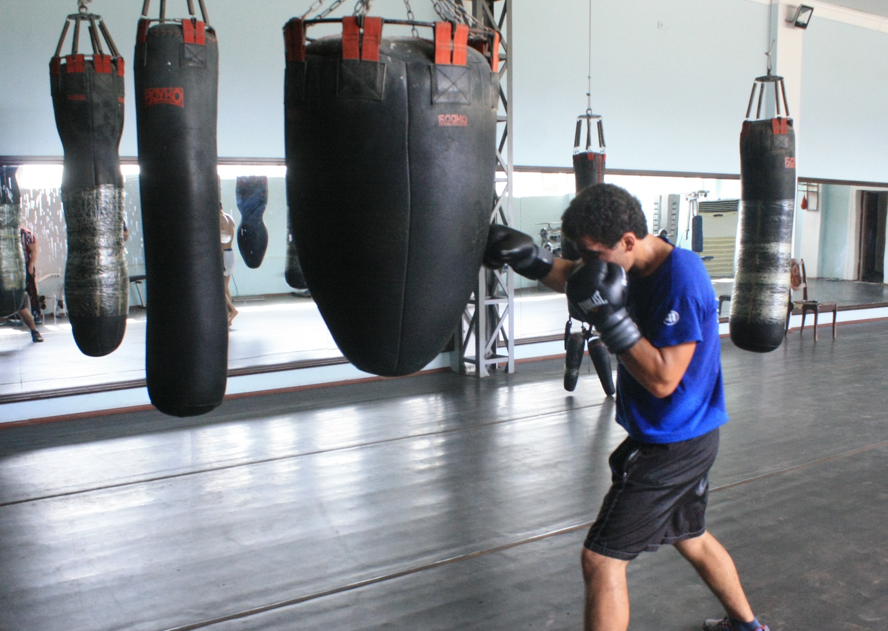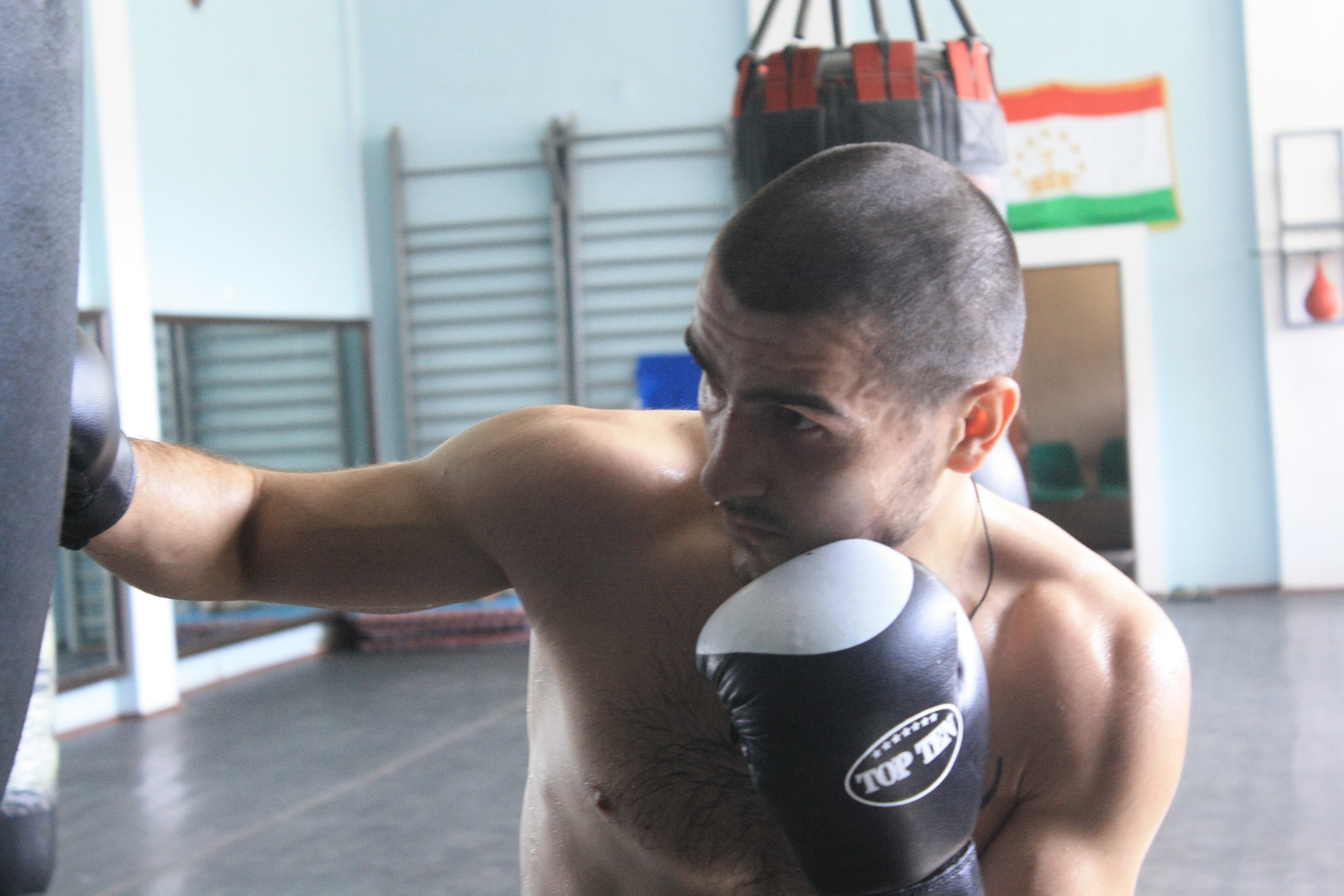 Грузинский боксер-профессионал Джаба Шалуташвили в боксёрском зале стадиона «Локомотив» в Душанбе ведет подготовку к бою против таджикского боксера Шерали Мамадалиева. Поединок между этими боксерами является главным боем вечера профессионального бокса, который пройдет в Душанбе 1 октября.