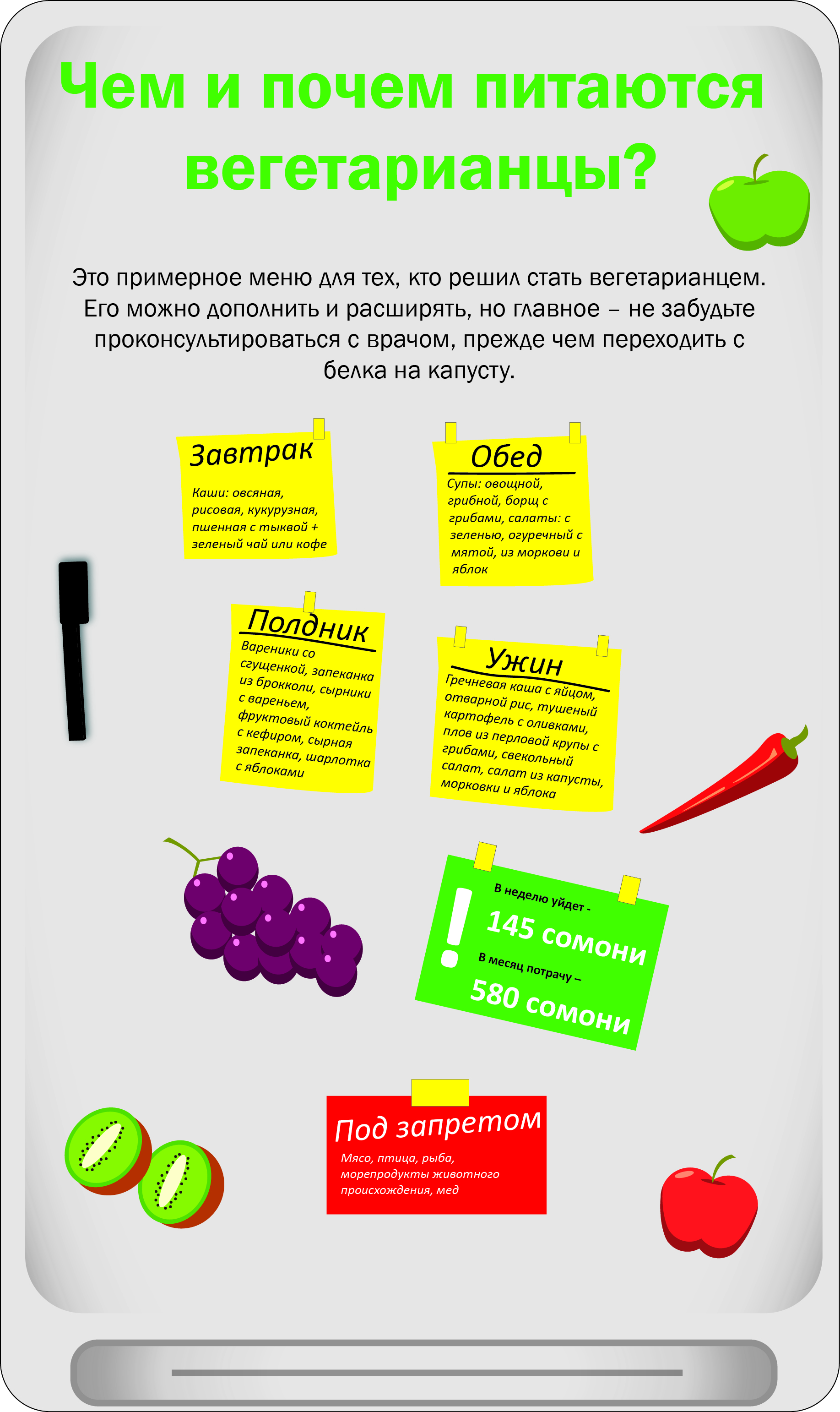 — Сейчас легче, намного легче, я бы даже сказал, что по сути уже есть все условия. Но, тогда, в 2009-м мне было тяжело. Было не так много доступных продуктов неживотного происхождения, а те, что были, стоили дорого. Я считаю, что вегетарианство в Таджикистане — это пока удел людей небедных. Тогда мне приходилось есть обычное меню общепита – каша гречневая, пюре, капуста или макароны, есть много хлеба. Вегетарианских супов у нас попросту не существует. Местная кухня – это почти всегда мясные изделия, и потому получалось что на всех днях рождениях, свадьбах я ел помидорчики и огурчики из салатов. В общепите ел сплошные углеводы и думаю, такое вегетарианство не было полезным. В итоге, хотя близкие сильно переживали за то, что я исхудаю, за год набрал дополнительно килограммов 7-8.