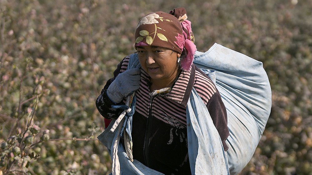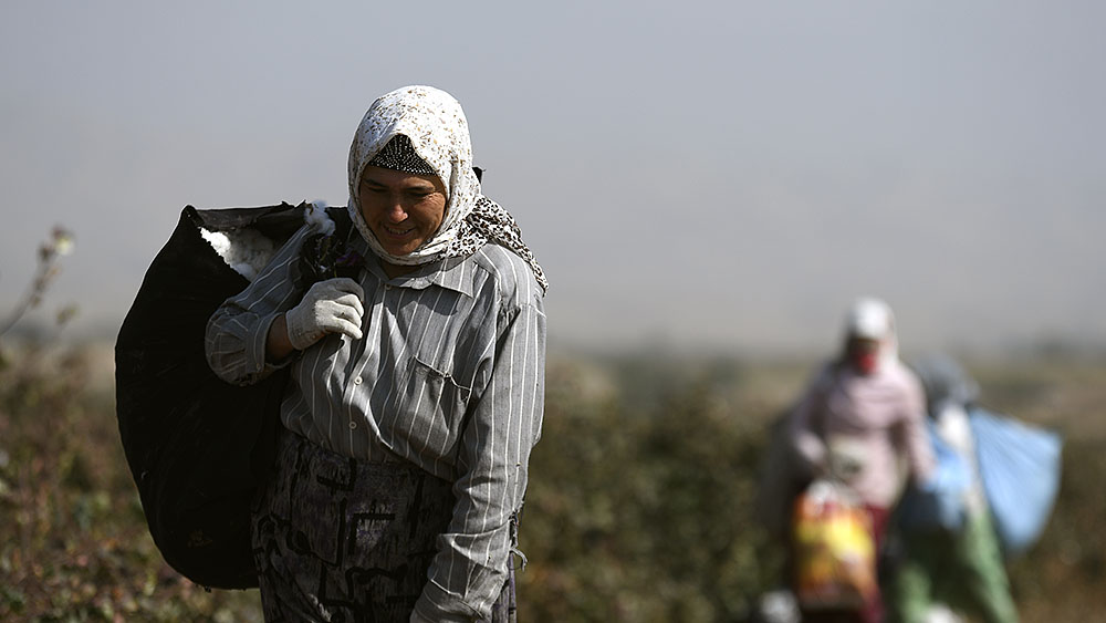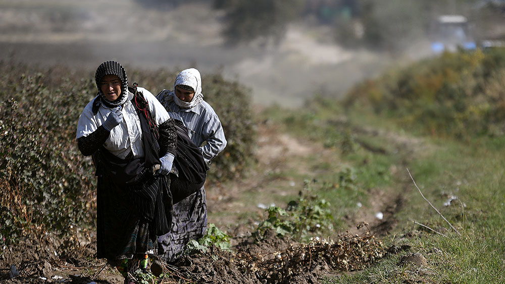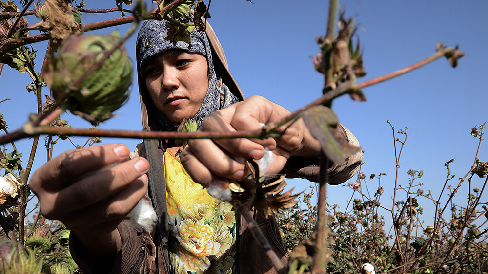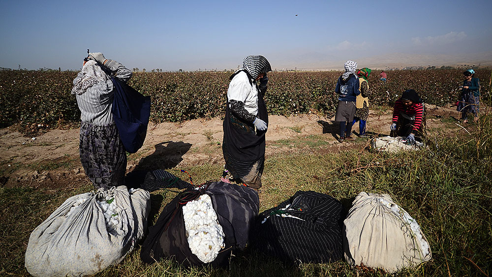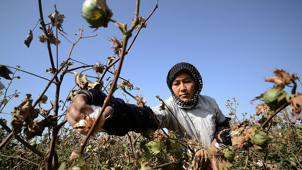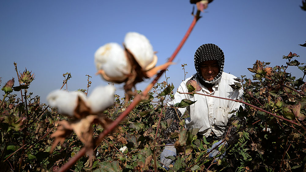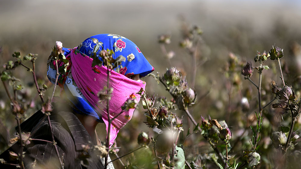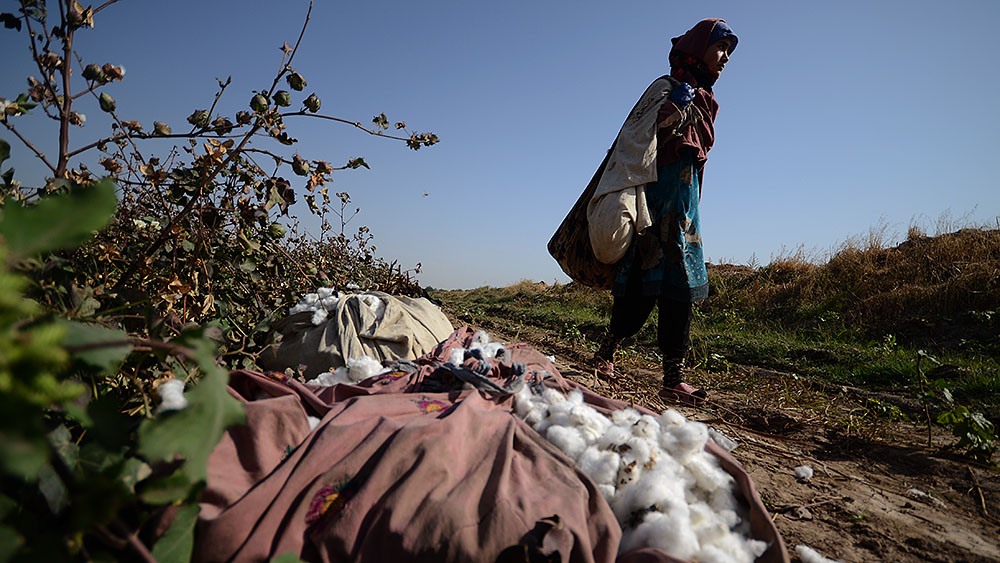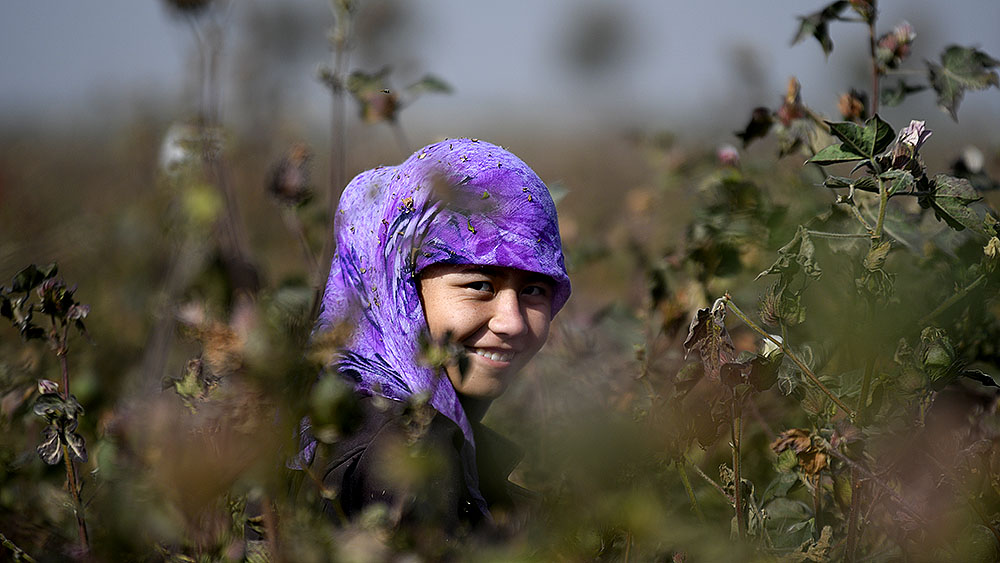 На первый взгляд кажется, что на поле никого нет — из-за необычайно высоких стеблей хлопчатника сборщиков совсем не видно.