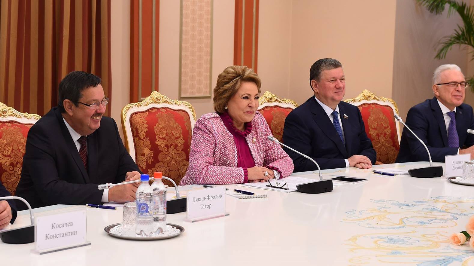 В составе делегации СФ также заместитель председателя СФ Евгений Бушмин, председатель комитета СФ по международным делам Константин Косачев, первый зампредседателя комитета СФ по обороне и безопасности Александр Чекалин, первый зампредседателя комитета СФ по аграрно-продовольственной политике и природопользованию Сергей Лисовский, зампредседателя комитета СФ по науке, образованию и культуре Виктор Кресс, член комитета СФ по международным делам Рафаил Зинуров, члены комитетов по бюджету и финансовым рынкам и по обороне и безопасности Мухарбий Ульбашев и Баир Жамсуев, а также член Совета Федерации Андрей Шевченко.