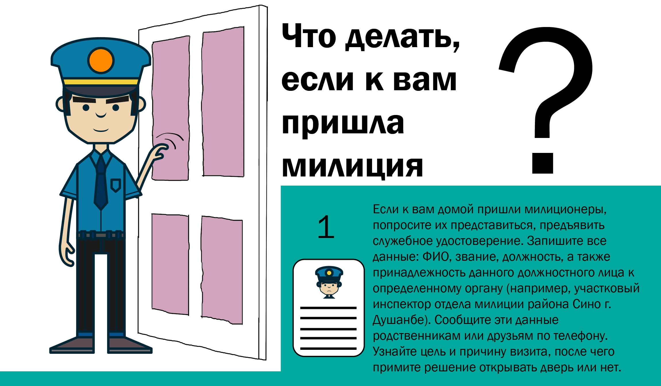 В Коалицию по пыткам обратилась 34-летняя жительница Душанбе, которую избили сотрудники милиции. Инцидент произошел в ее квартире, куда милиционеры вломились без разрешения. Что делать в таких случаях, смотрите в нашей инфографике.