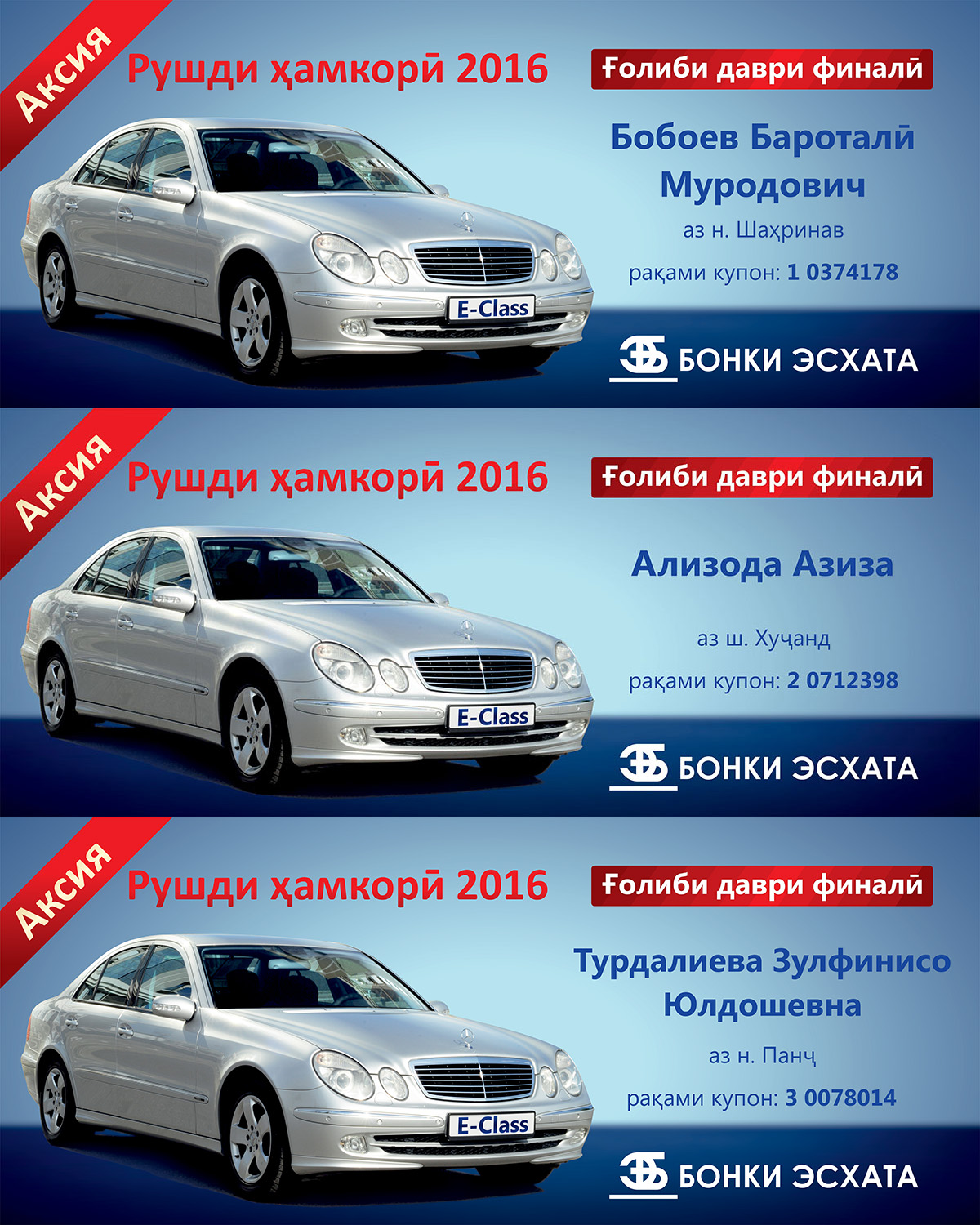 Баротали Бобоев из Шахринавского района, Азиза Ализода из города Худжанда и Зулфинисо Турдалиева из Пянджского района Хатлонской области стали главными победителями акции Банка Эсхата “Рушди хамкори – 2016”.