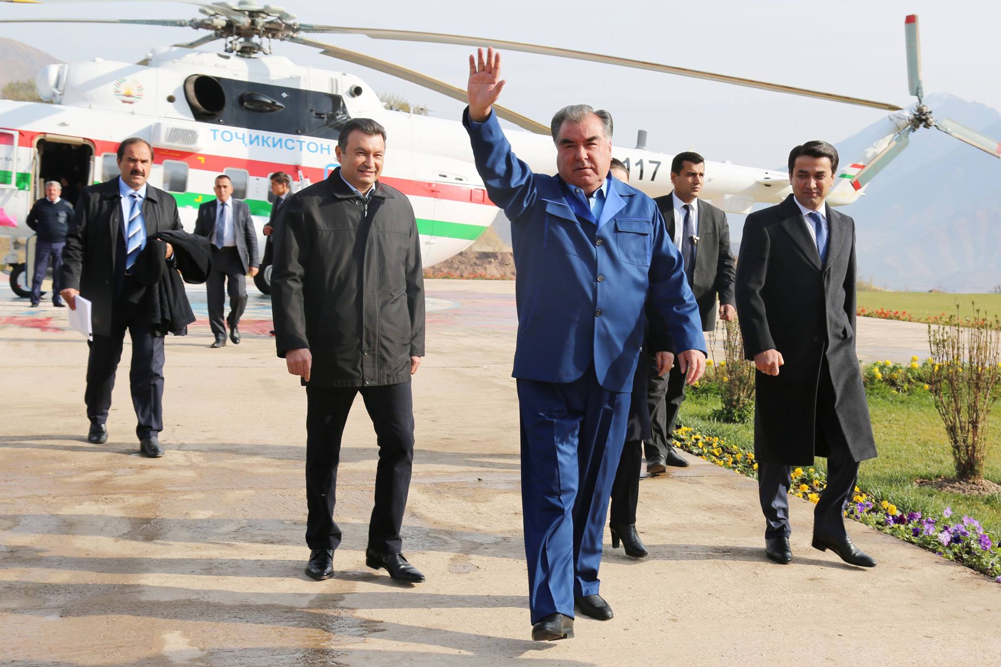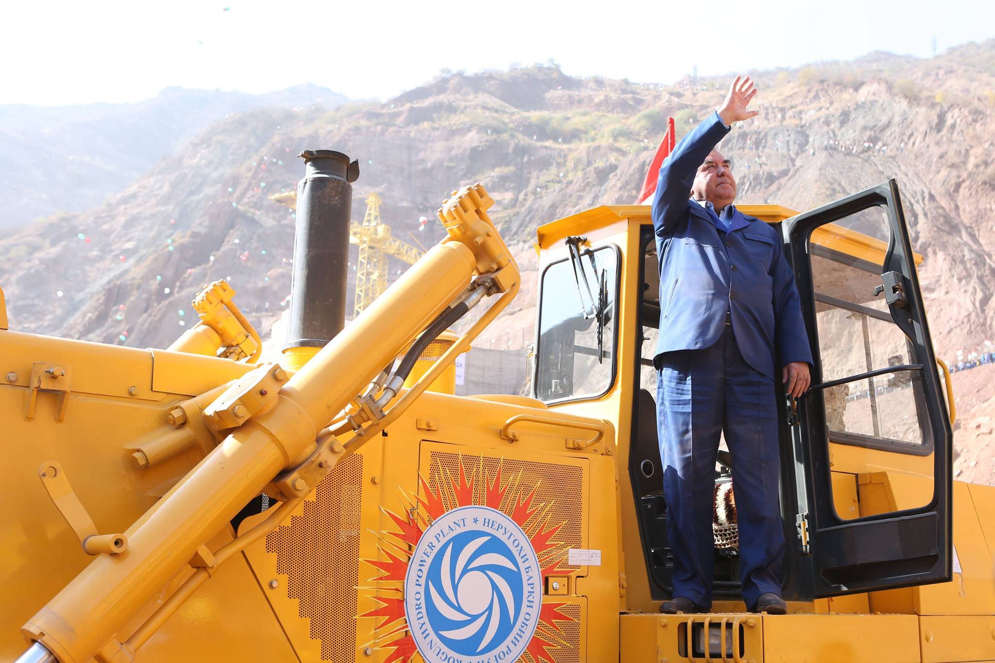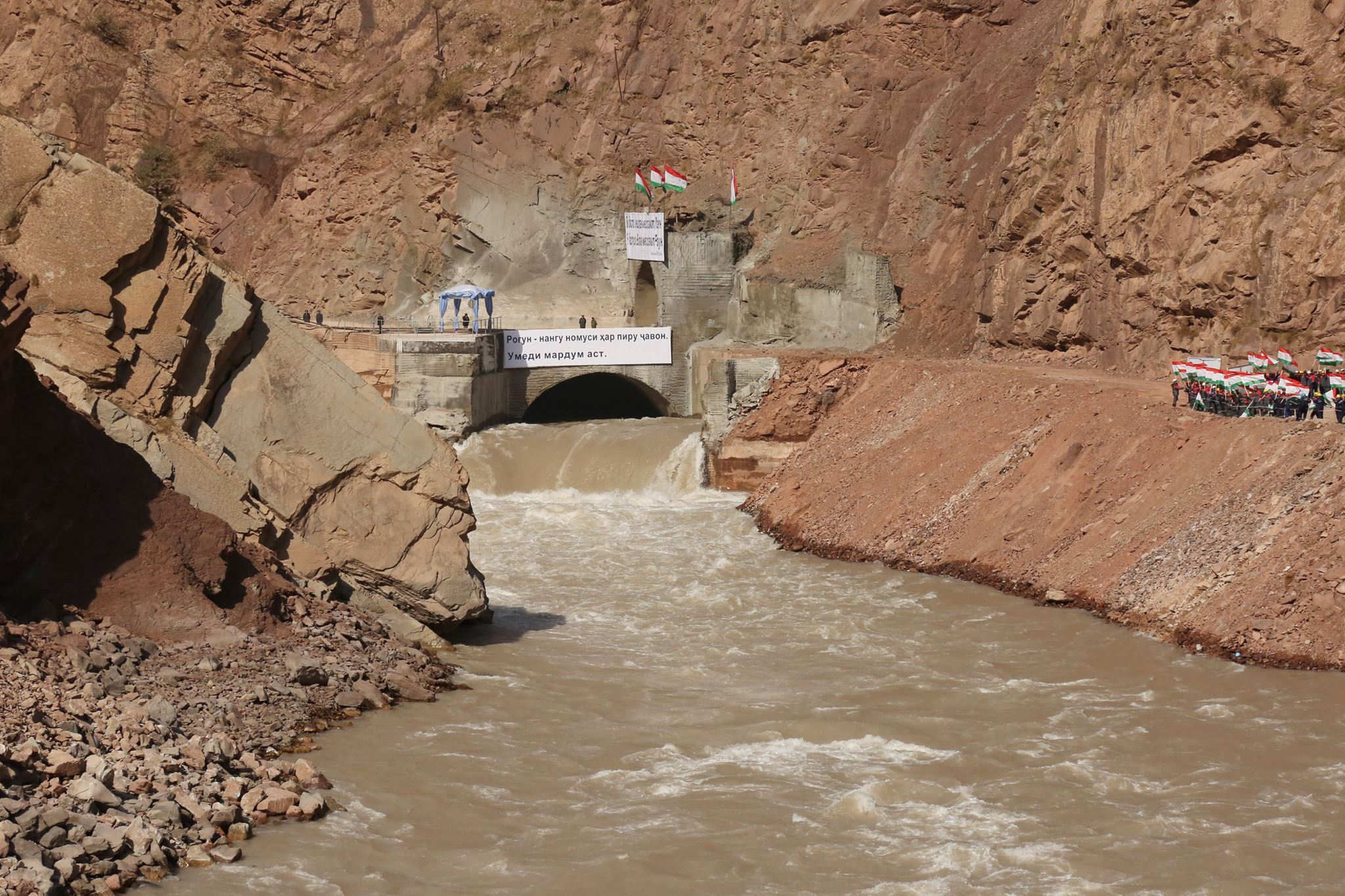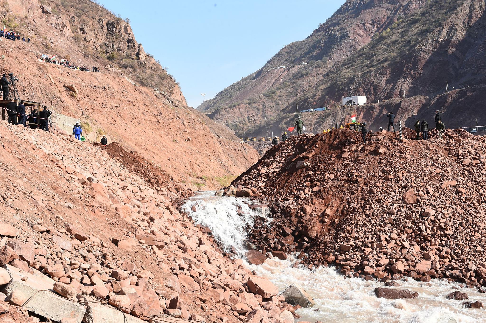 Эмомали Рахмон и другие участники церемонии стали свидетелями изменения русла реки Вахш, пуска воды по водосбросным тоннелям, пройдя которые вода вновь впадает в реку.