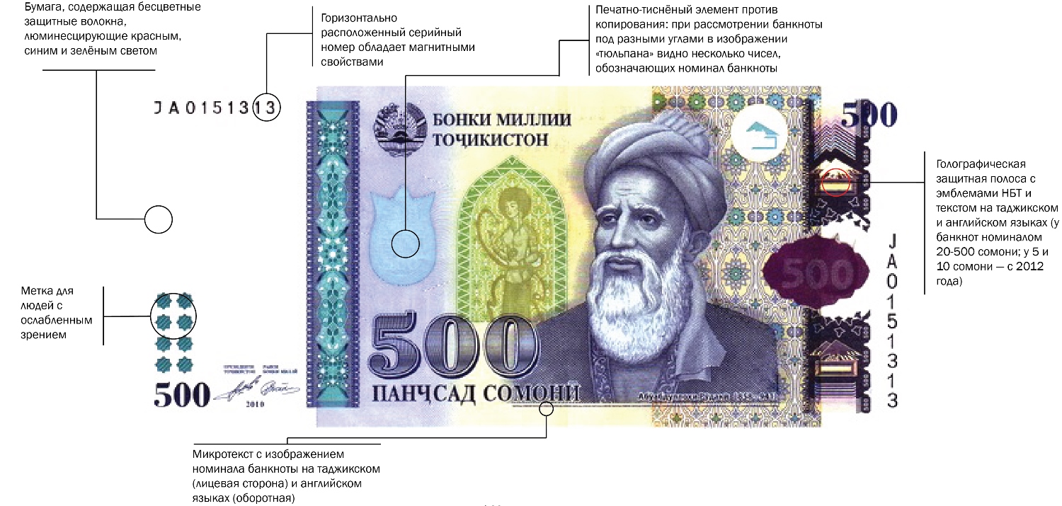 30 октября 2000 года в Таджикистане была введена новая национальная валюта – сомони. На лицевой стороне таджикских купюр — портреты выдающихся политических и культурных деятелей, на оборотной изображены современные памятники архитектуры страны. Банкноты, несомненно, красивые, но насколько серьезно они защищены от подделки? Посмотрите, какие защитные элементы должны быть у настоящего сомони, и остерегайтесь подделок.