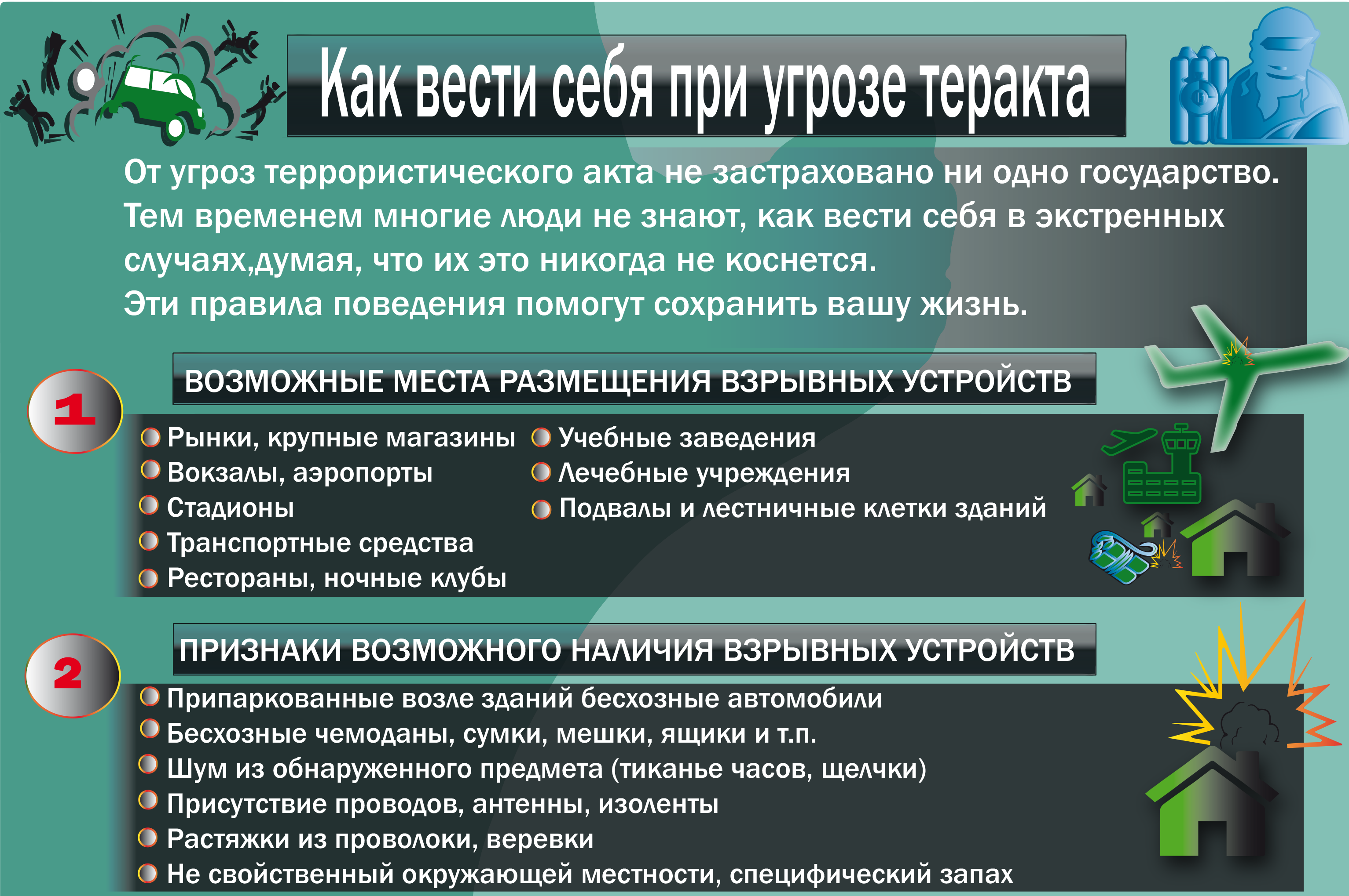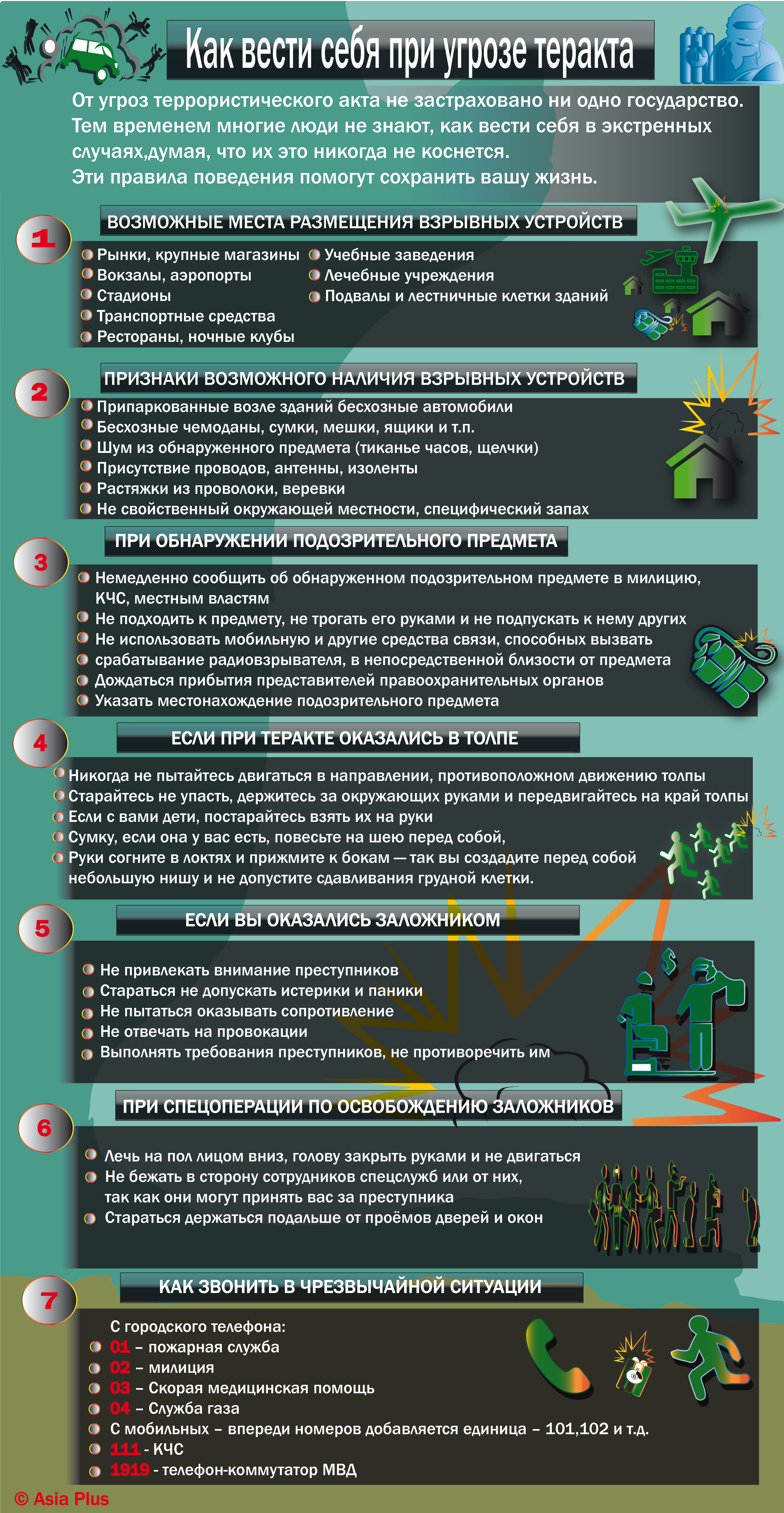 Согласно исследованию лондонского Института экономики и мира Таджикистан уязвим перед террористическими угрозами. Причем, согласно оценке, ситуация в нашей стране хуже чем у соседей по региону. Но мало кто знает, как правильно себя вести при угрозе теракта. Мы решили собрать главные правила поведения в такой ситуации в нашей инфографике.