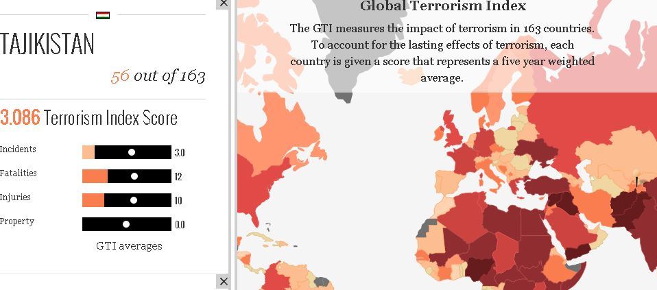 Таджикистан является наиболее уязвимым для террористической угрозы среди стран Центральной Азии. Об этом свидетельствует опубликованный 16 ноября Глобальный индекс терроризма, который ежегодно составляет лондонский Институт экономики и мира.