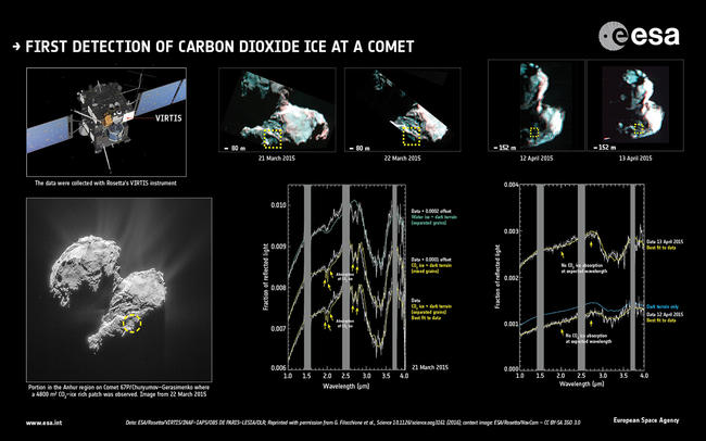 «Известно, что кометы содержат диоксид углерода, который после воды наиболее распространен в их атмосферах, но невероятно сложно увидеть его в твердой форме на поверхности», — заявил итальянский астрофизик Джанрико Филаккьоне.