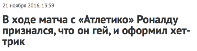 После этого больше сотни российских СМИ вышли с новостями о том, что Криштиану Роналду объявил себя геем. Заголовок «Криштиану Роналду признался в нетрадиционной ориентации» даже вошел в топ-5 главных новостей дня в «Яндекс.Новостях».