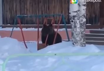 В городе Колпашево (Томская область) медвежонок пришел на детскую площадку и попытался покататься на качелях. Но качели оказались слишком маленькими для него.