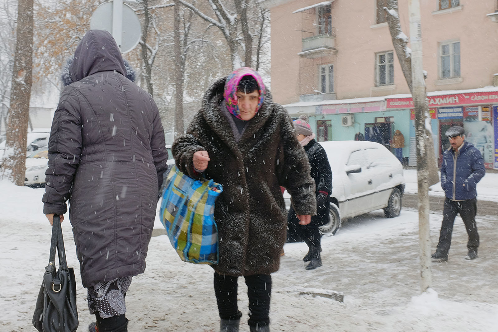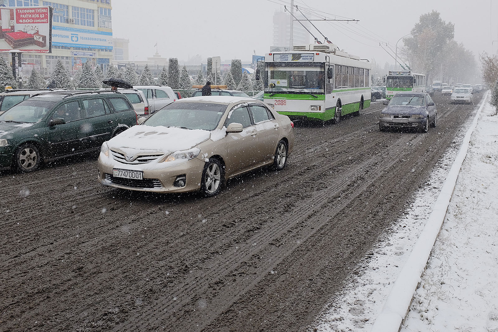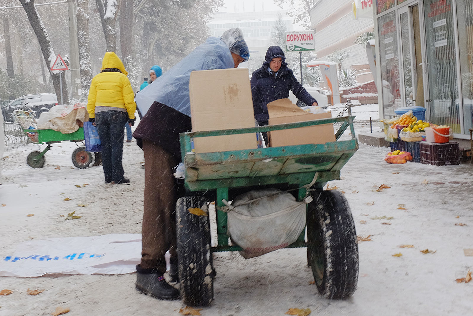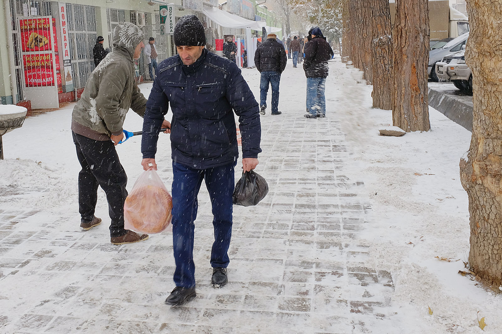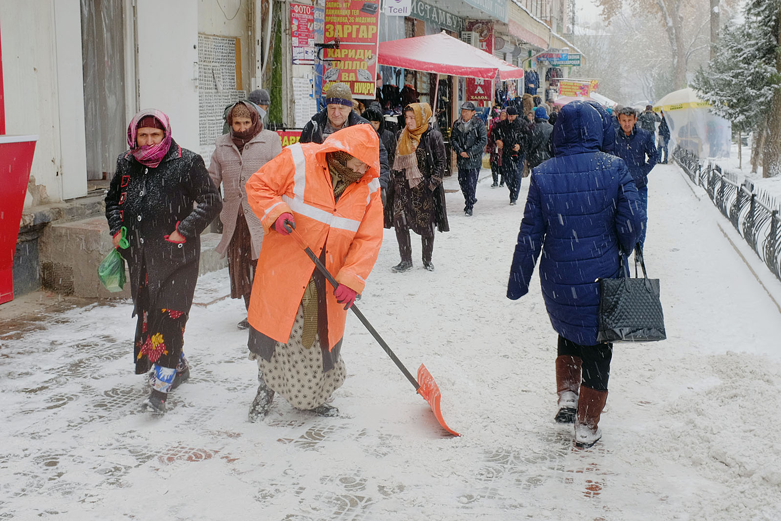 Привыкшие к теплой осени и поздней неснежной зиме душанбинцы уже неделю никак не адаптируются к холоду. Легкие осенние куртки и обувь – так одеты большинство местных жителей, вынужденных стоять в ожидании общественного транспорта или идти за покупками. Сложнее всего приходится уличным торговцам, которые пытаются обогреться всеми подручными средствами. Сегодняшние дороги напоминают сплошное месиво из грязи и снега. Потепление обещают только в начале следующей неделе.