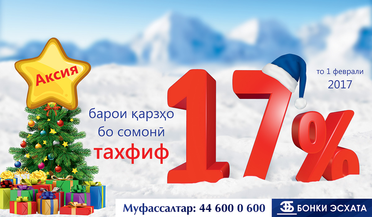 Приближаются новогодние праздники, и, как правило, все ждут подарки и сюрпризы. Банк Эсхата, в качестве новогоднего подарка для своих клиентов, объявляет новую акцию! В преддверии 2017 года, клиенты, обратившиеся в «Банк Эсхата» за кредитом, смогут получить скидку 17% от стоимости кредитов, выдаваемых в сомони.