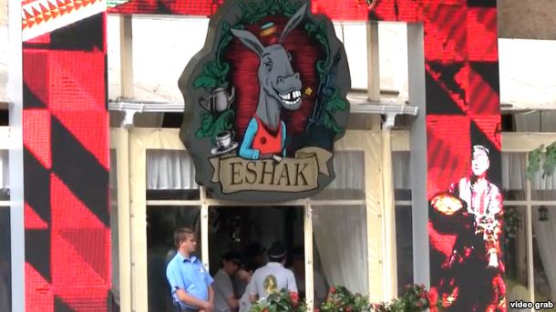 Облаченный в традиционный узбекский стеганый халат — чапан и тюбетейку Сергей Светлаков с казаном плова в руках и выглядывающий из-за плеча российского комика ишак пристально смотрят в объектив камеры. Это изображение — часть екатеринбургской рекламной кампании, посвященной открытию нового заведения сети ресторанов Eshak российского комика Сергея Светлакова. Название ресторана в переводе с узбекского означает «осел», «ишак».