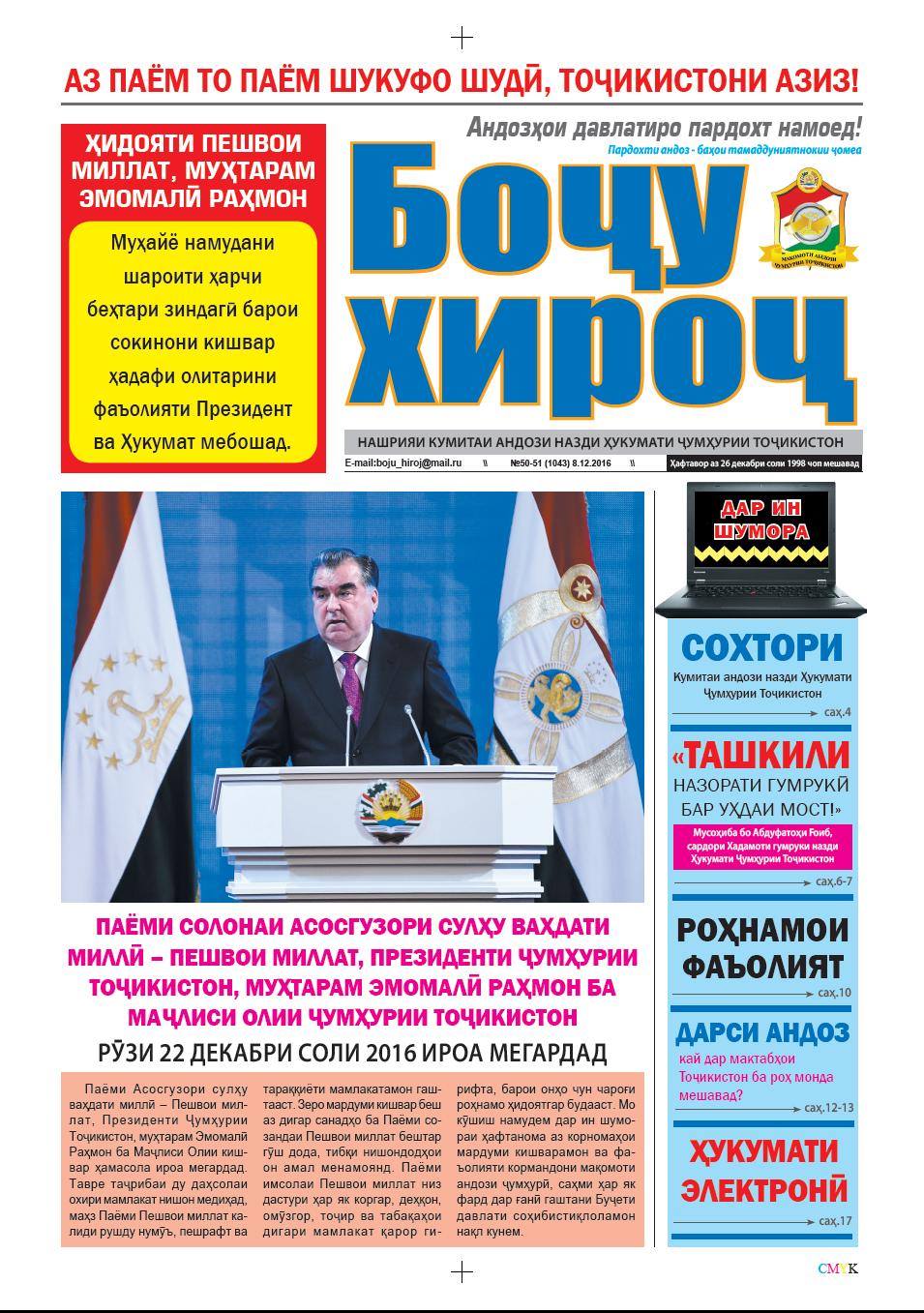 Вышел в свет специальный выпуск еженедельника «Бочу хироч», издания Налогового Комитета при Правительстве Республики Таджикистан, посвященный Посланию Основателя мира и национального единства — Лидера нации, Президента Республики Таджикистан Эмомали Рахмон в Маджлиси Оли республики.