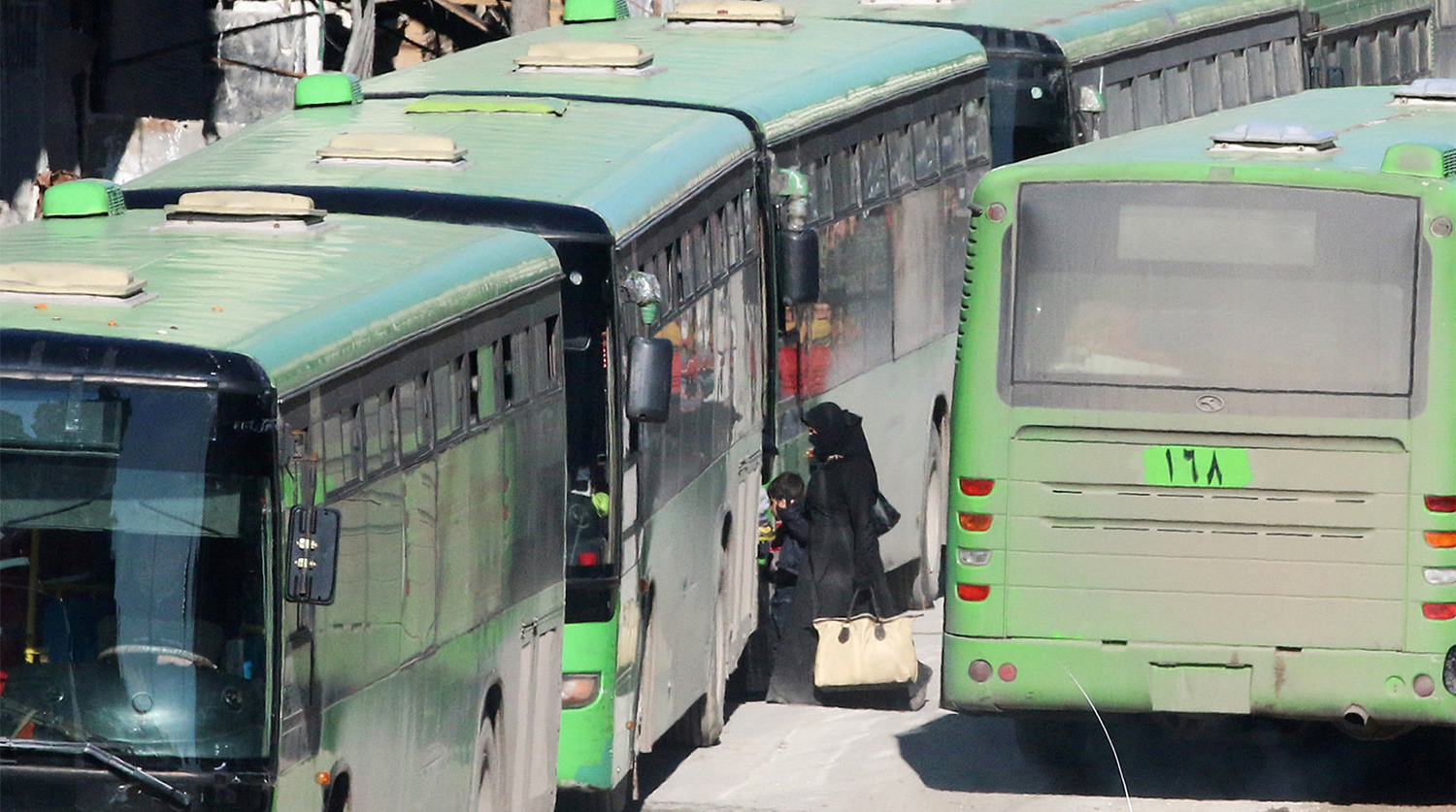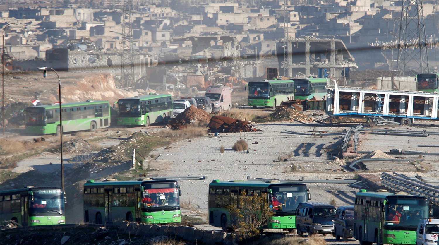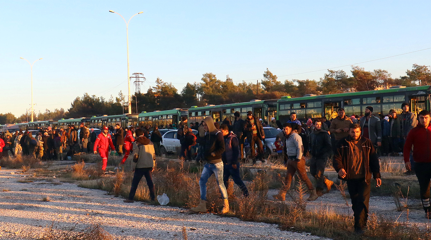 Из Алеппо эвакуируют жителей и вместе с ними — боевиков с семьями в провинцию Идлиб, находящуюся под контролем вооруженных группировок.