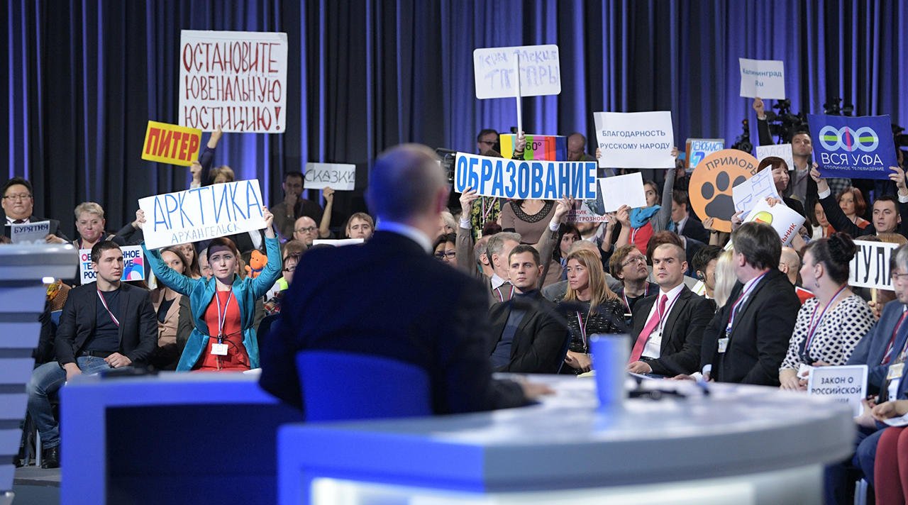 Примирительная интонация. Отвечая на вопросы, Путин много рассуждал о необходимости прислушиваться друг к другу — и вообще занял примирительную позицию. На внешних врагов России он только намекал, и то не прямо. При этом Путин заострял внимание на необходимости «чувства меры» и в либеральной, и в консервативной среде.