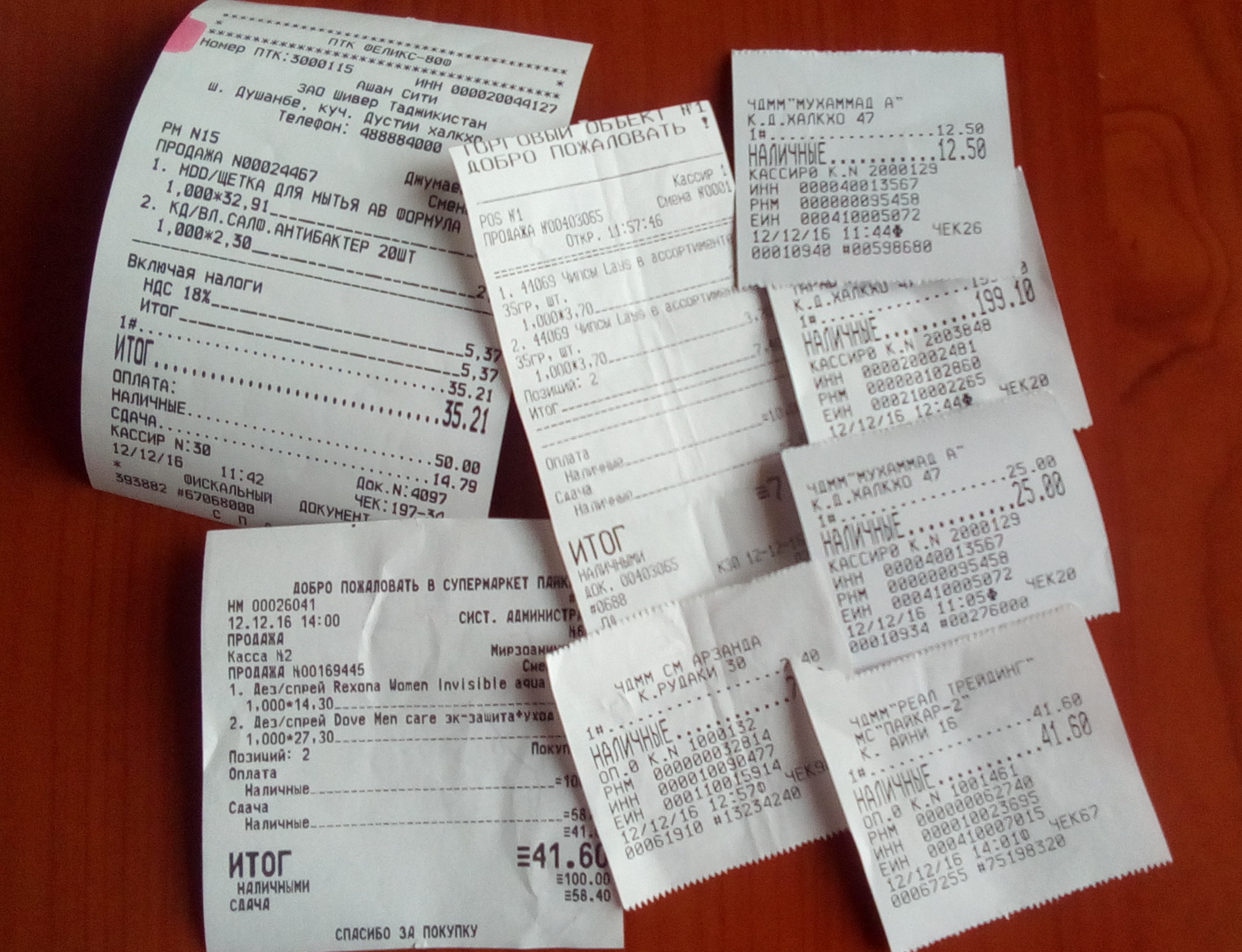 Например, в магазине «Товары из Китая» на проспекте Рудаки, где нам чеки также не выдали, указав, что контрольно-кассовую машину для выверки (гашения) отнесли в районную налоговую инспекцию.