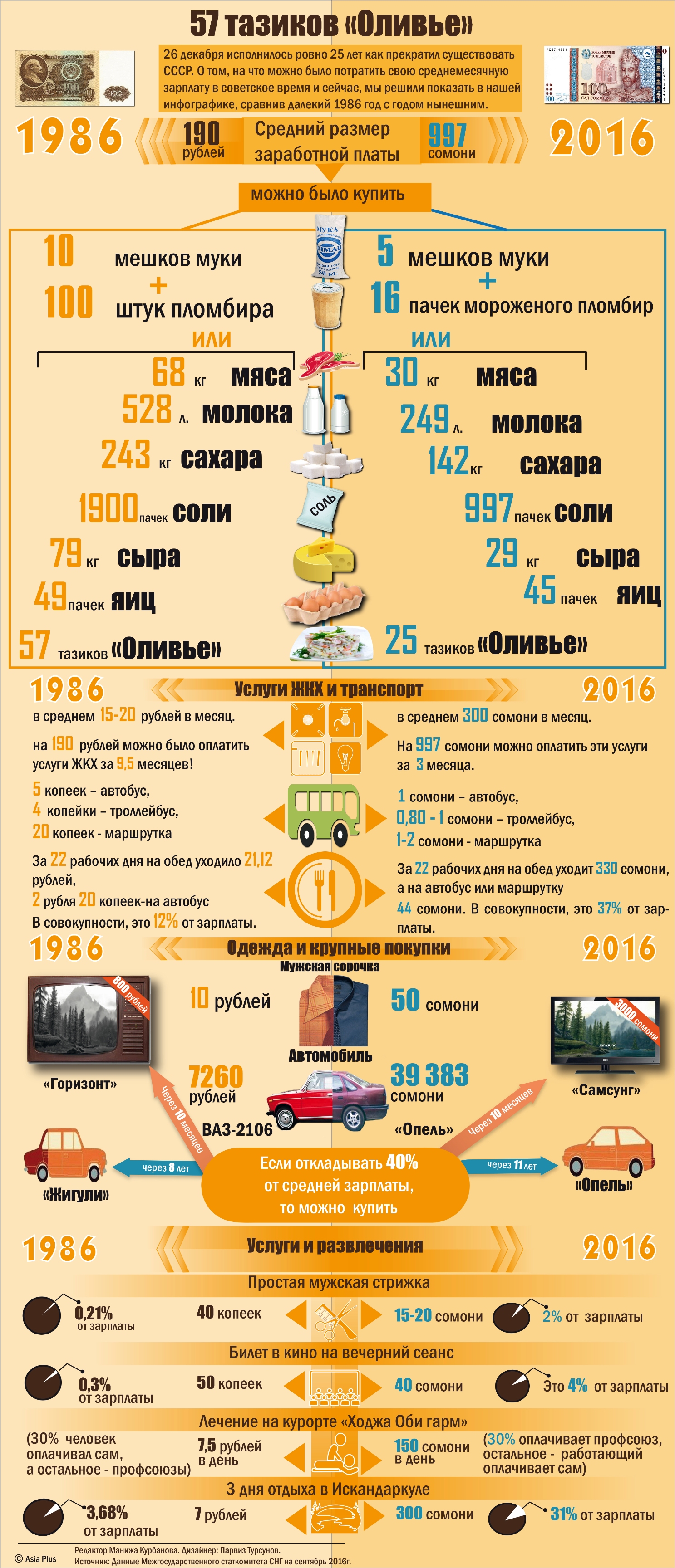 Уже четверть века как нет СССР, но те, кто жил в ту эпоху, любят вспоминать советский период, сравнивая его с нынешним. О том, какие цены на продукты и товары первой необходимости были в советские времена и сейчас, мы решили показать в нашей инфографике, взяв для сравнения показатели 30-летней давности — 1986 и 2016 годов. Хотя не стоит все воспринимать однозначно: есть разница в качестве товаров и услуг и много чего, что было недоступно тогда и сейчас.