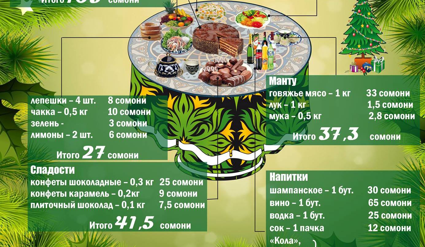 Предновогодние хлопоты – это, как обычно, поход за продуктами в магазины и на рынки. Мы решили узнать, во сколько сомони может обойтись праздничное угощение при выборе самого распространенного среди населения меню, с учетом продуктов, рассчитанных на среднестатистическую семью из 6 человек. Что у нас получилось, смотрите в нашей инфографике.
