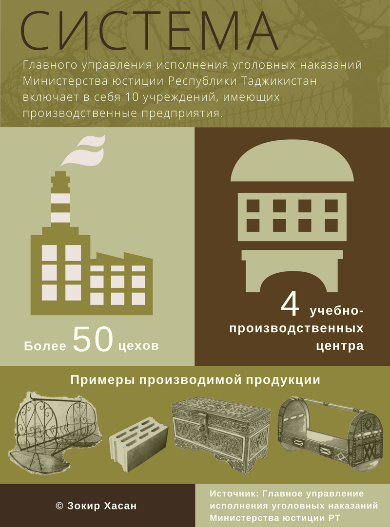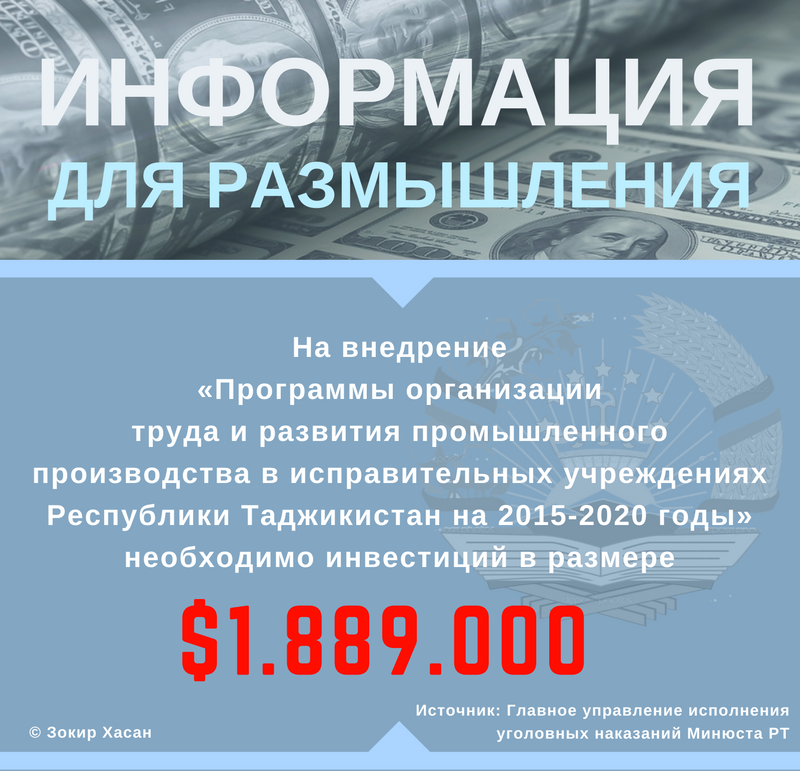 Сотрудники исправительных учреждений и эксперты уверены, что программа по организации труда и промышленного производства в исправительных учреждениях Таджикистана поможет решить эти проблемы. «Программа предусмотрена на 6 лет, на ее внедрение необходимы инвестиции в размере 1 889 000 долларов», — сообщил Нурулло Джалолов.