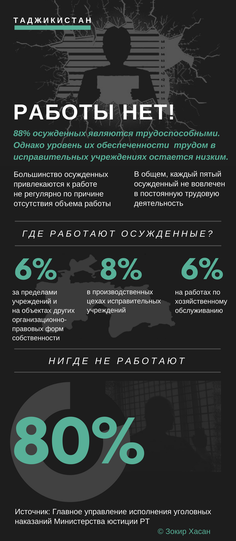 Большинство заключенных привлекаются к работе не регулярно, в связи с отсутствием объема работы. В общем, каждый пятый осужденный не вовлечен в постоянную трудовую деятельность.