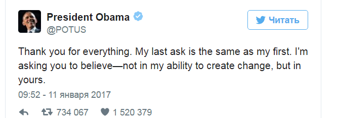 Спасибо за всё. Моя последняя просьба такая же, как и первая. Прошу вас верить — не в мои способности создавать изменения, но в ваши, — гласит прощальный президентский твит Обамы