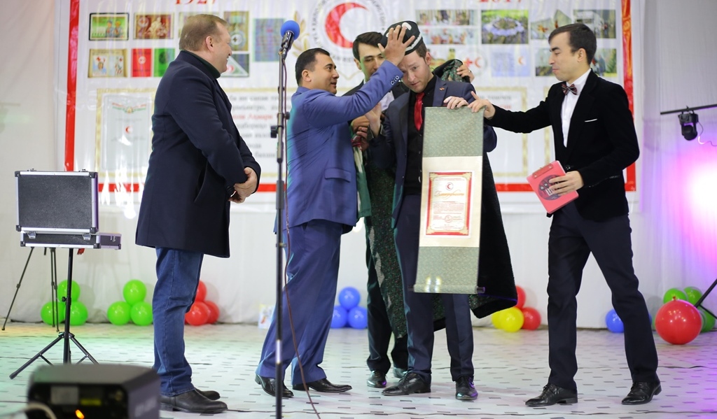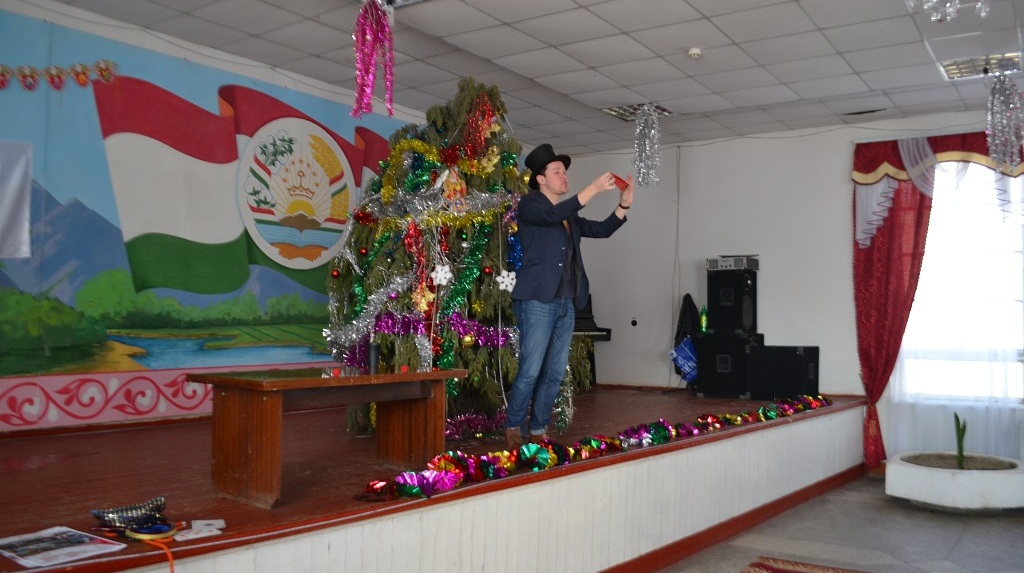 У машины глава офиса ОКПТ в Согде Парвиз Джабборзода в знак благодарности надел на плечи фокусник национальный халат «чапан»: «С вашей помощью, Валентин, и вашего искусства, удалось создать новогоднюю атмосферу детям, находящимся в социальных учреждениях, за что вам огромная благодарность».