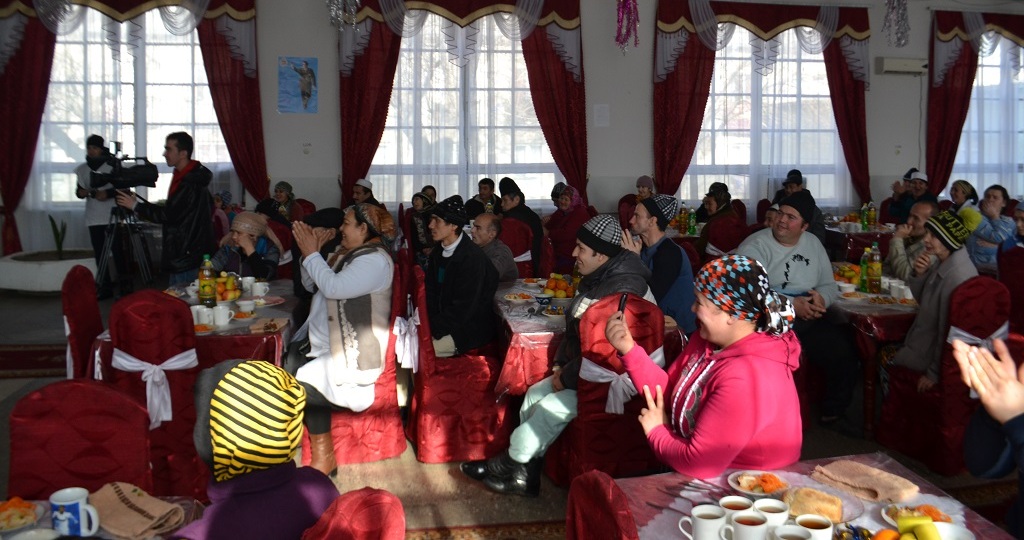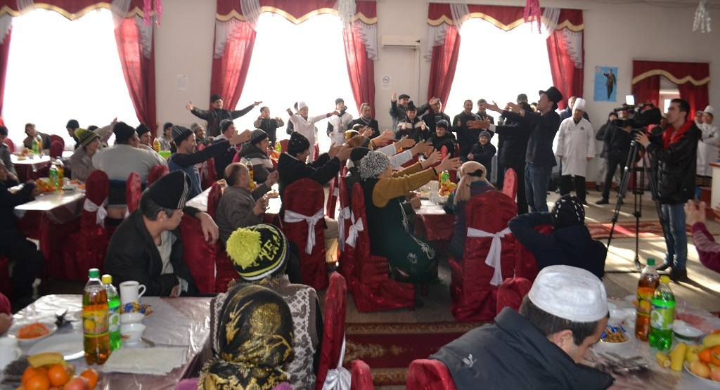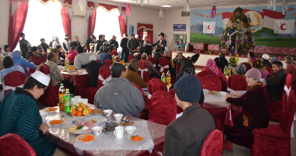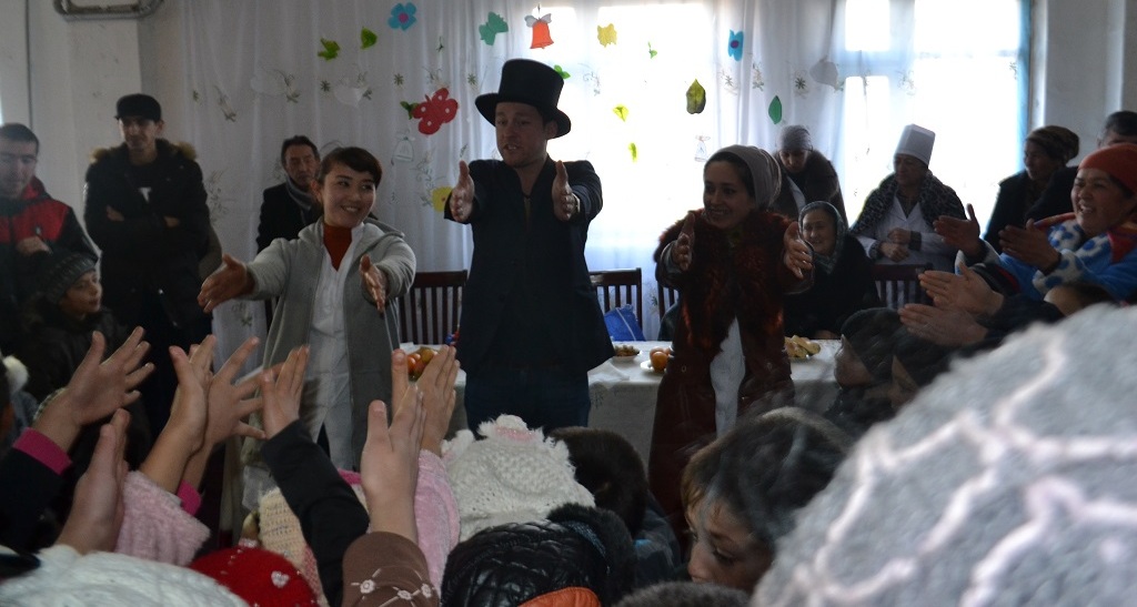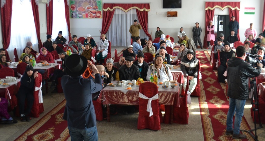 У машины глава офиса ОКПТ в Согде Парвиз Джабборзода в знак благодарности надел на плечи фокусник национальный халат «чапан»: «С вашей помощью, Валентин, и вашего искусства, удалось создать новогоднюю атмосферу детям, находящимся в социальных учреждениях, за что вам огромная благодарность».