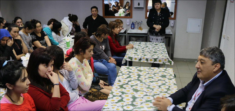 После короткой беседы мы идем на встречу с содержащимися в центре женщинами. «Обычно мы просим собрать именно женщин, поскольку они более уязвимы», — поясняет Даврон. Фото- и видеосъемка в центре запрещена, нам разрешили фотографировать только в столовой, где нас уже ожидали порядка 40 женщин разных возрастов. Среди них – гражданки Узбекистана, Киргизии, Молдавии, Украины, Вьетнама, Китая.