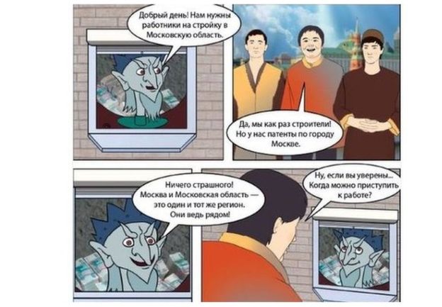 Первым делом приезжим объясняют, что нужно получить миграционную карту, «регистрацию» и патент на работу. В поясняющем комиксе Кащей Бессмертный на фоне стопок с деньгами предлагает мигрантам устроиться на стройку в Московской области, хотя у них патенты по Москве. Но Снегурочка объясняет, что патент, полученный в Москве, действует только на территории города.