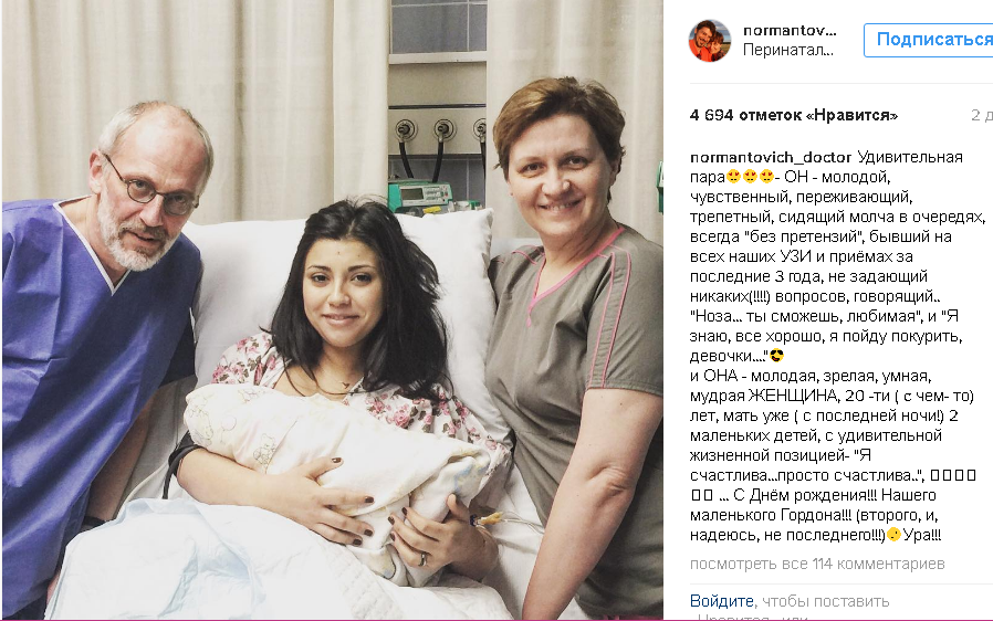О пополнении в семье Гордона сообщила в Instagram главный врач московского перинатального медицинского центра Татьяна Нормантович, принимавшая роды.