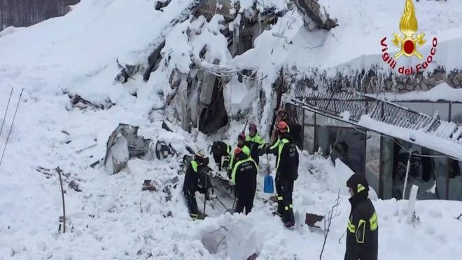 Сход лавины в центральной Италии был вызван землетрясением, которое произошло 18 января. Спасателям удалось добраться до заваленного снегом отеля Ригопиано только на следующее утро.