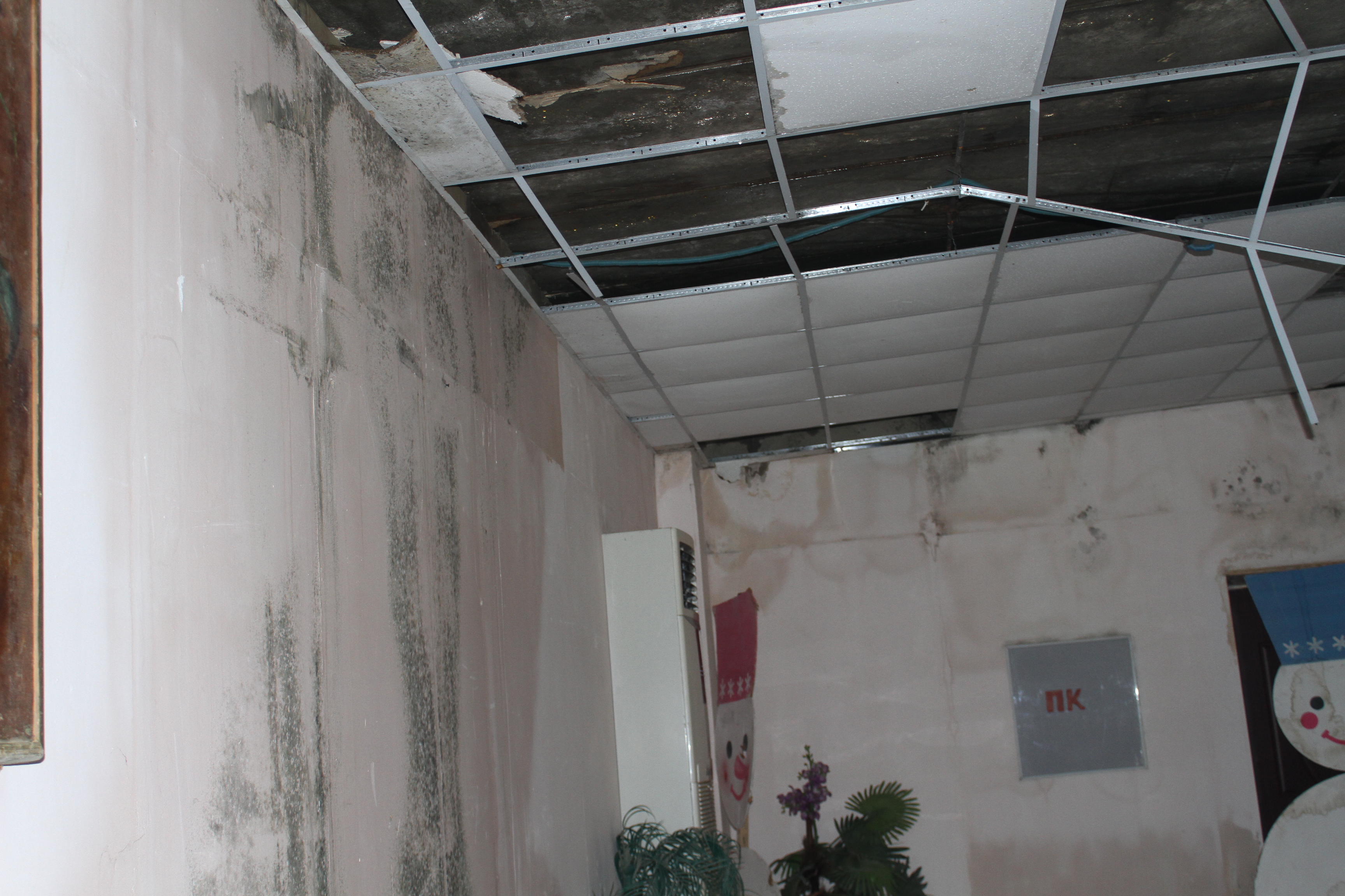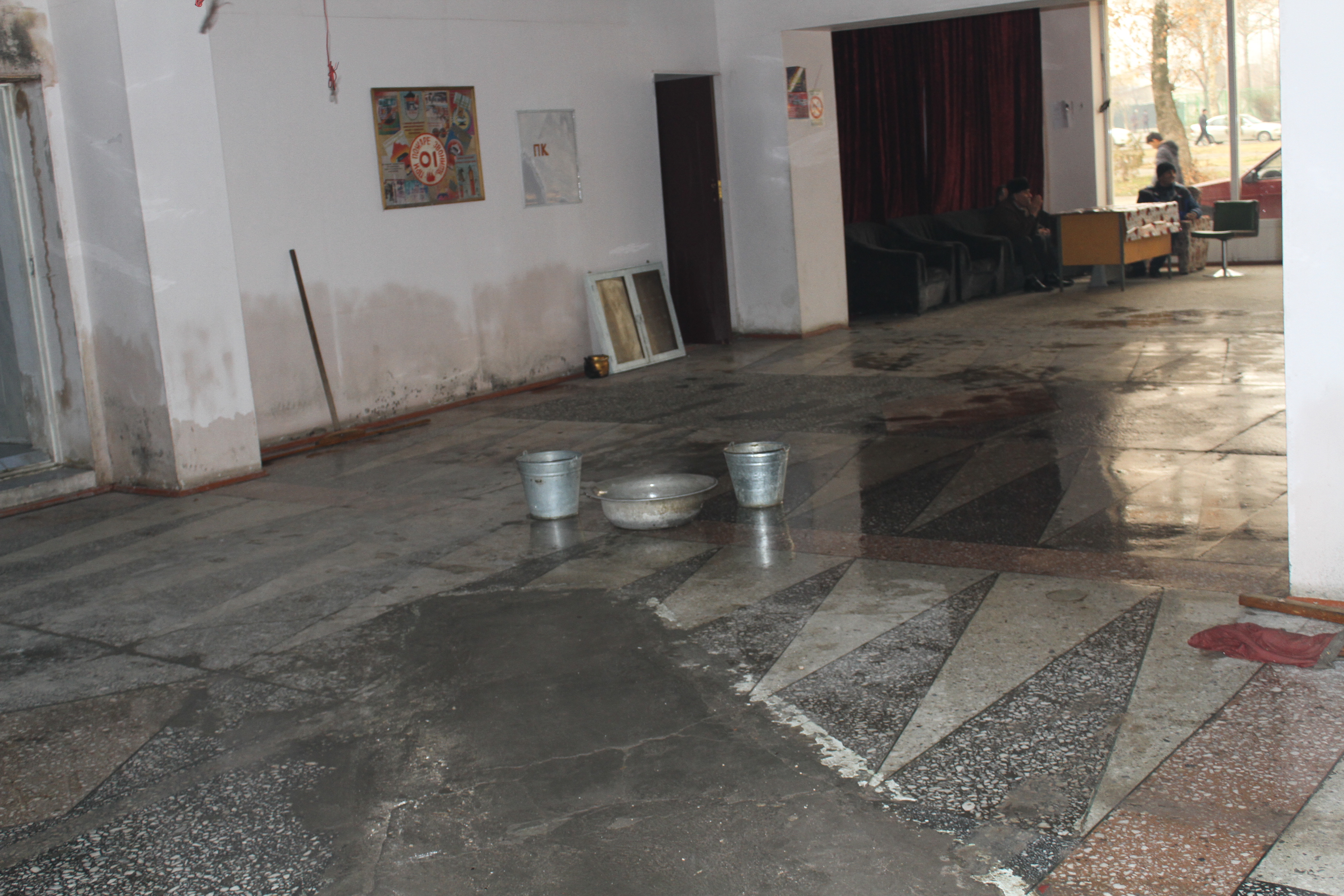 В фойе на каждом метре стояли тазы и ведра, в которые капала вода; потолок уже успел подмокнуть так, что в нем зияли огромные дыры. Еще резкий запах плесени и сырости, т.е. капает здесь давно.