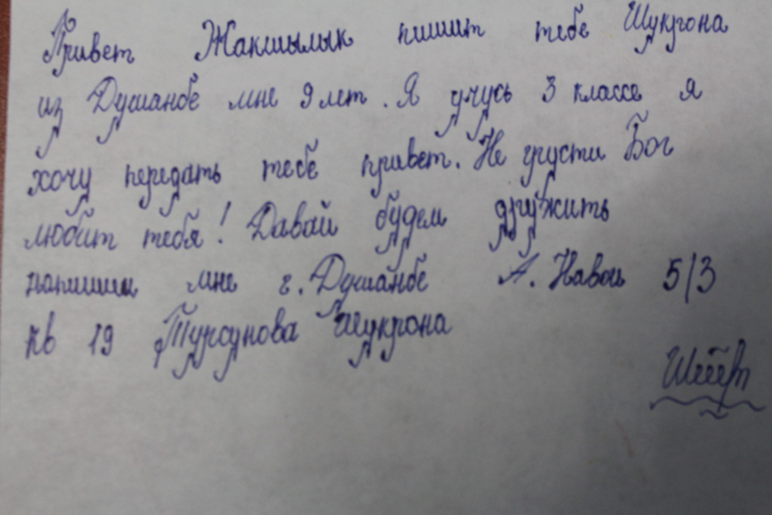 В своих письмах дети из Таджикистана пишут Жакшылыку: — «Не грусти. Бог любит тебя. Знай, мы с тобой. Ты не горюй, у тебя обязательно будет очень много друзей. Нам было бы очень приятно с тобой общаться и увидится в будущем! До скорой встречи». Ровесники Жакшылыка желают с ним подружиться и написали свои домашние, электронные адреса для переписки.