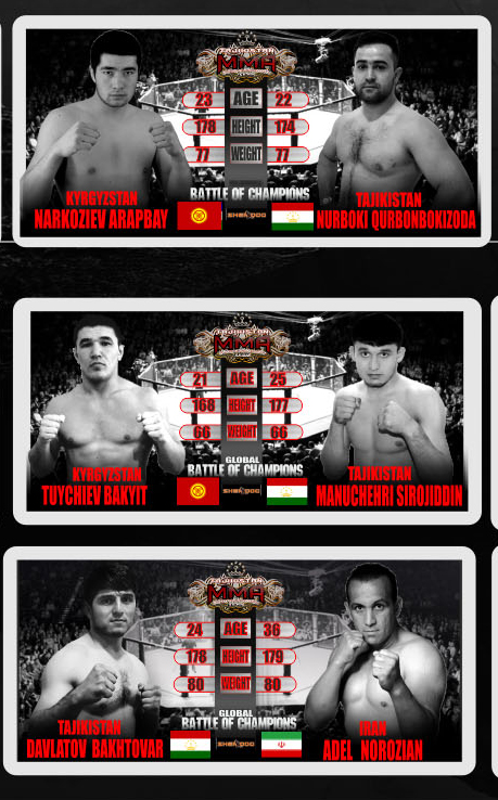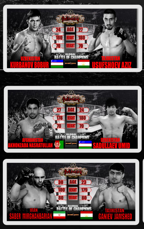 В турнире, который пройдет в столичном Госцирке, примут участие известные  бойцы Таджикистана, а также гости соревнований – спортсмены Ирана, Франции, Камеруна, Узбекистана,  Кыргызстана и Афганистана, сообщил «АП» вице-президент Федерации ММА Таджикистана Умед Назаров.