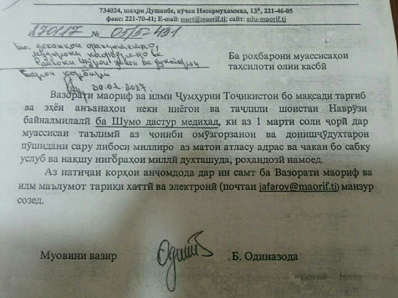 В письме, которое адресовано во все образовательные учреждения страны, говорится, что с 1 марта преподавателям и учащимся вузов и школ рекомендовано в честь Международного праздника Навруз носить традиционную таджикскому народу одежду из атласа, адраса и чакан с национальным орнаментом.