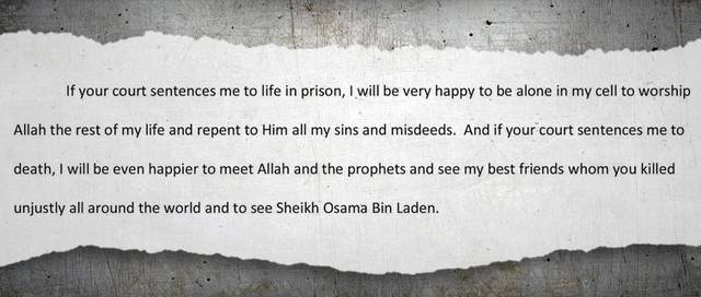 «Я с радостью буду один в камере молить Аллаха всю оставшуюся жизнь и каяться за все грехи. А если ваш суд приговорит меня к смерти, то с еще большей радостью встречу Аллаха и пророков, увижусь со своими друзьями, которых вы несправедливо убивали по всему миру, и увижу шейха Усаму бен Ладена».