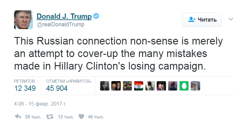 «Эти бессмысленные сообщения о российских связях являются просто попыткой скрыть многие ошибки, совершенные в ходе проигранной кампании Хиллари Клинтон», — написал президент в Twitter.