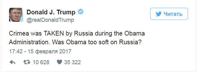 В другой своей записи в Твиттере Трамп заявил, что «Россия забрала Крым» во время правления его предшественника Барака Обамы. «Был ли Обама слишком мягким по отношению к России?» — написал Трамп в своем твитере.