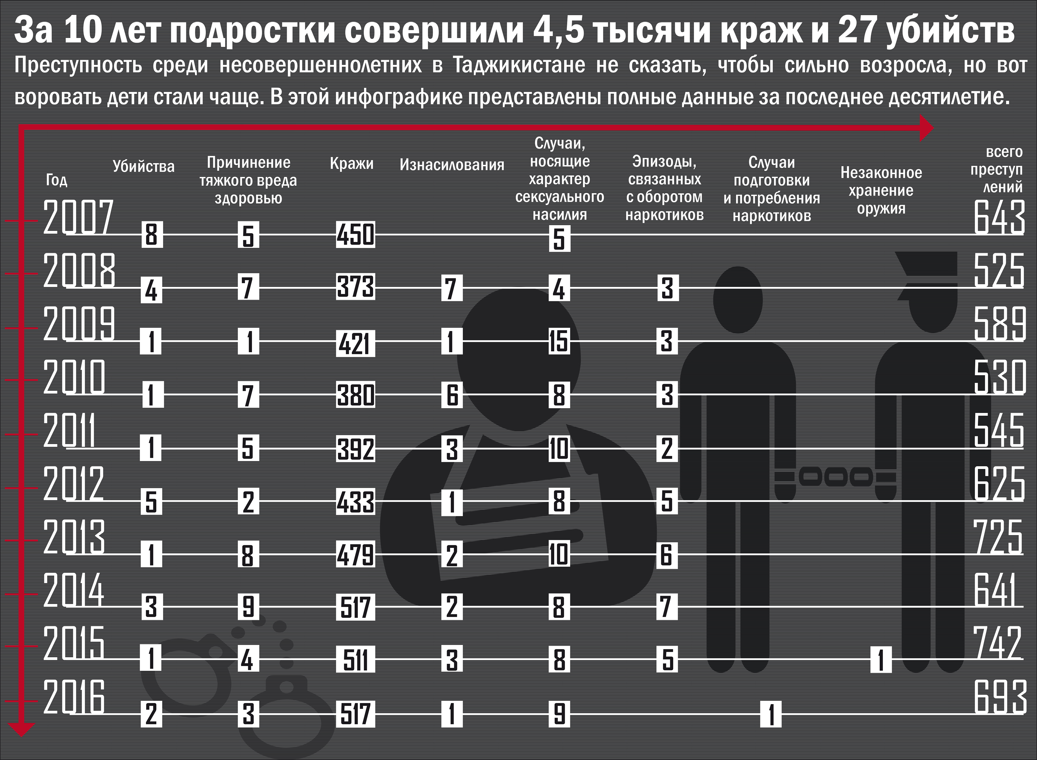 «В прошлом году были зарегистрированы пять преступлений среди несовершеннолетних, которые связаны с массовыми драками, и все эти преступления были совершены в столице. Только в январе текущего года в столице Таджикистана зарегистрировано три факта поножовщины, устроенных подростками, в результате погибли два человека», — сообщил генпрокурор.