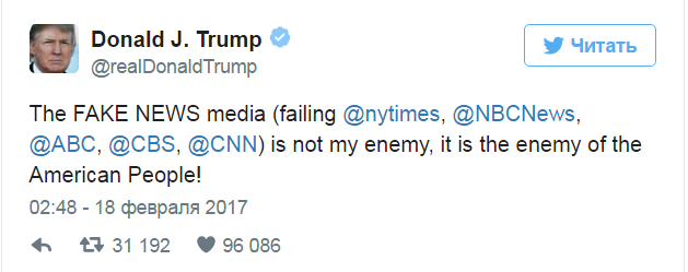 «СМИ фейковых новостей (The New York Times, NBC, ABC, CBS, CNN) являются не моим врагом, а врагом американского народа», — написал Трамп.