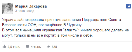 Официальный представитель МИД РФ Мария Захарова написала в своем фейсбуке, что это характеризует нынешнюю украинскую власть.