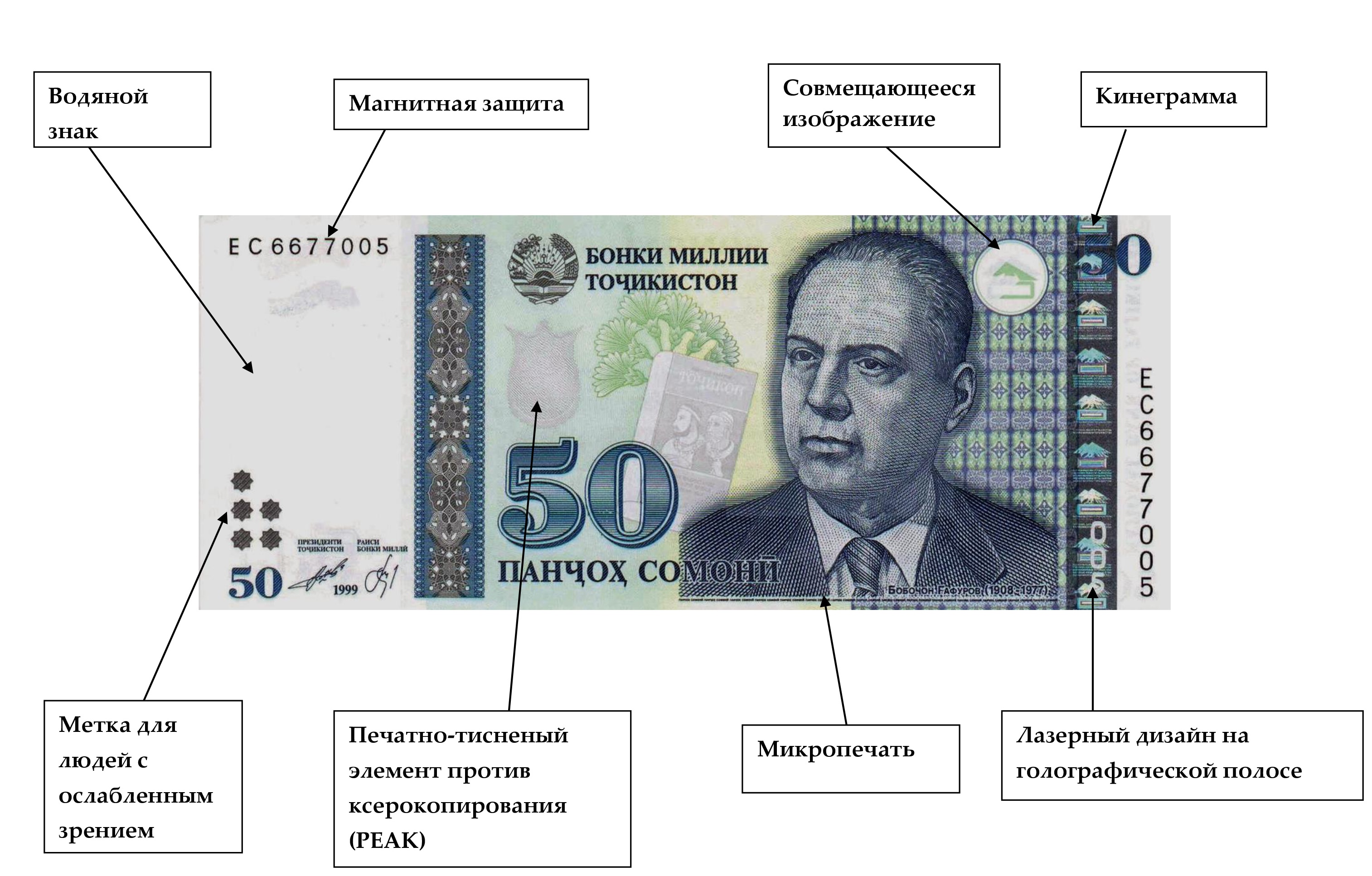 Чтобы не стать жертвой фальшивомонетчиков, необходимо знать защитные элементы национальной валюты Таджикистана — сомони. Сегодня мы ознакомим вас с защитными элементами банкноты достоинством 50 сомони – это одна из самых распространенных банкнот.