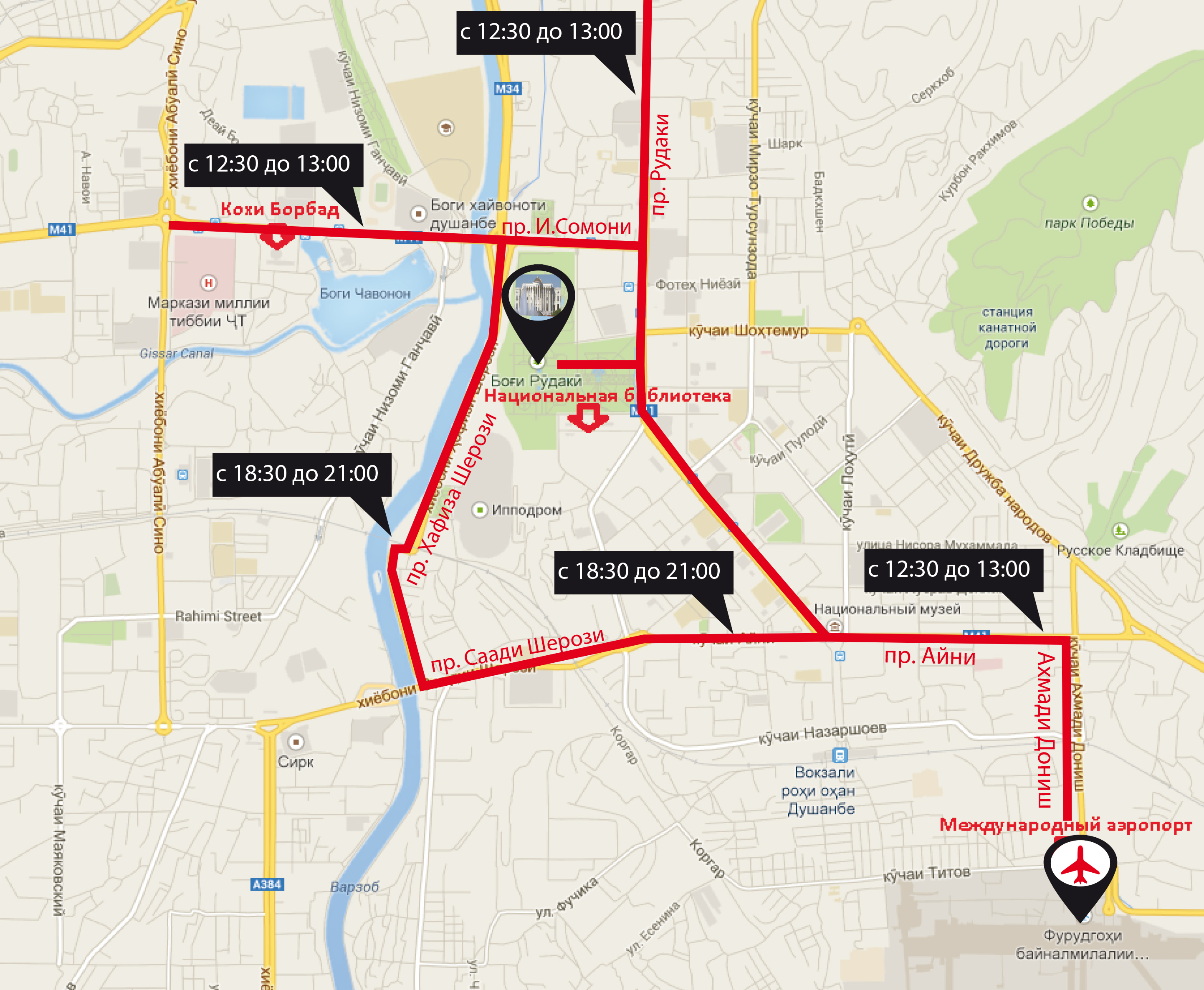 В частности, сегодня с 12:30 до 13 часов будет перекрыто движение автотранспорта по улицам Рудаки, Айни, Ахмади Дониш, от пересечения улиц А.Дониш — Айни до аэропорта, и от аэропорта до Дворца нации по проспекту Исмоила Сомони, начиная с перекрестка И.Сомони — Рудаки.