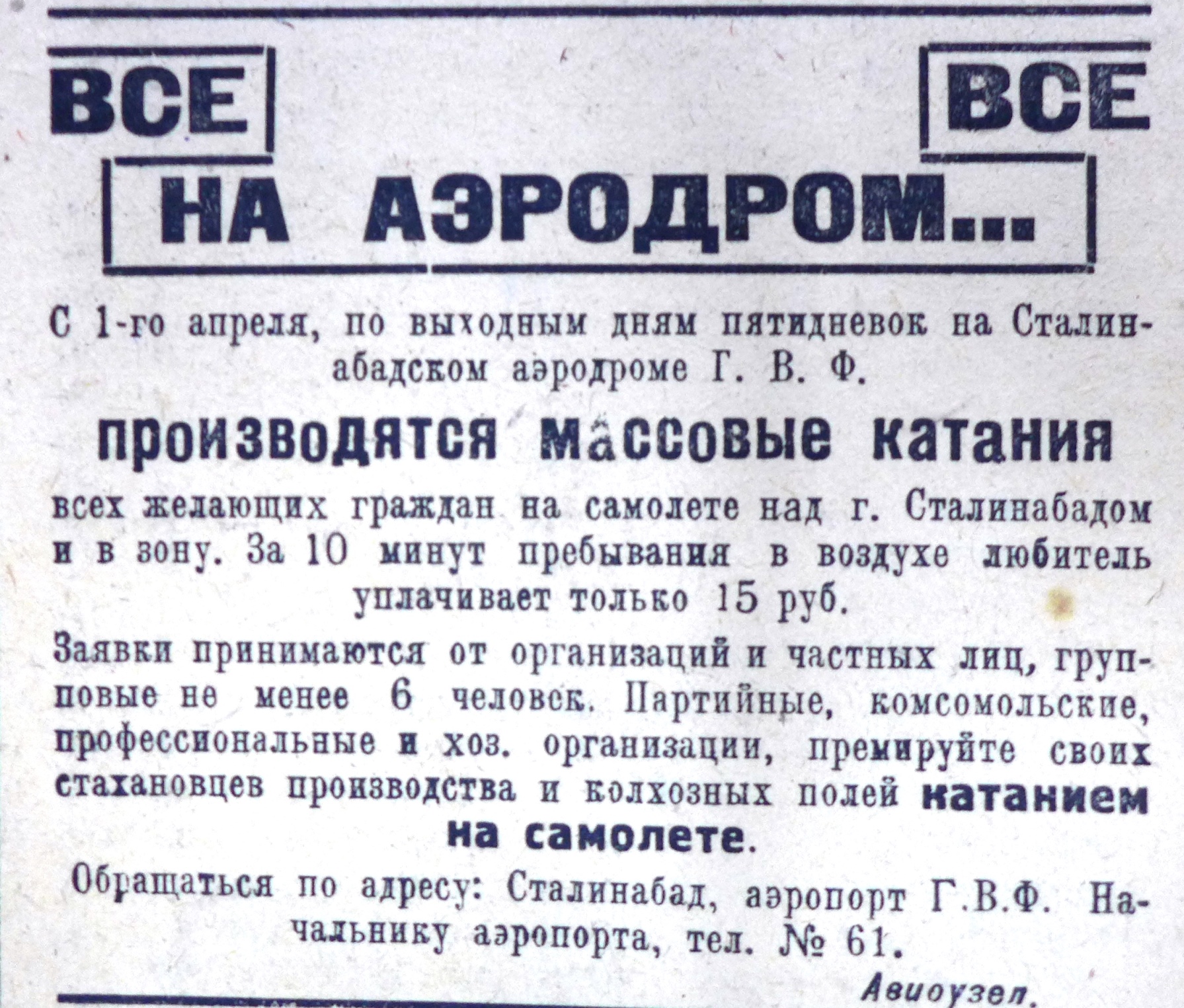 Небольшой аэродром в Душанбе был оборудован в районе нынешнего проспекта Рудаки (Ленина), на участке от Дома печати до Министерства юстиции. На слегка выровненном пустыре построили небольшую взлетно-посадочную полосу. Для хранения горючего и материально-технической части были смонтированы два ангарчика-сарая.