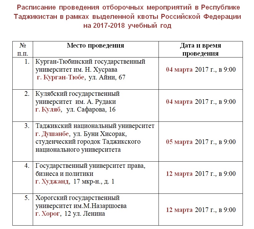 С 4 по 16 марта 2017 года в Таджикистане проводятся отборочные мероприятия для поступления в российские университеты в пределах квоты, установленной постановлением Правительства Российской Федерации.