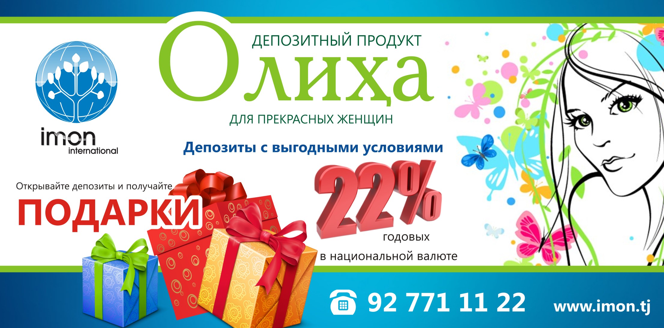 С наступлением весны и в честь Дня Матери МДО «ИМОН ИНТЕРНЕШНЛ» предлагает открыть для прекрасной половины человечества депозитный счет «Олиха» с очень выгодными условиями. Депозит открывается в национальной валюте на один год под 22% годовых. Минимальная сумма — 1000 сомони. Вклад можно пополнять, при этом проценты ежемесячно капитализируются и могут выплачиваться клиенту.