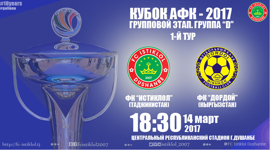 Матч первого тура группового этапа Кубка АФК-2017 в группе «D» между клубами «Истиклол» (Таджикистан) и «Дордой» (Кыргызстан) пройдет 14 марта на Центральном республиканском стадионе Душанбе.